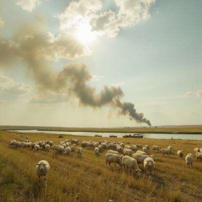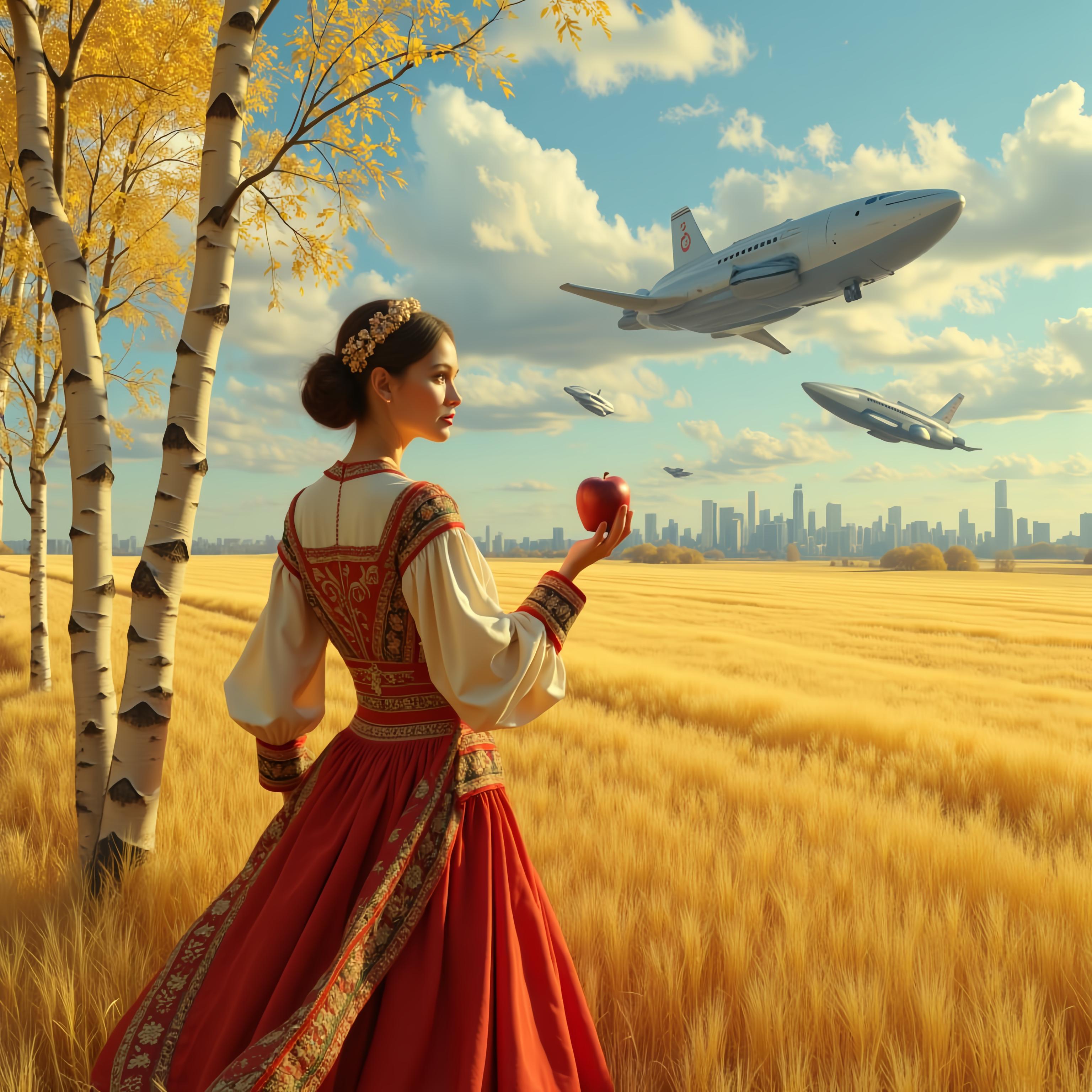 Сделай картину к отрывку, И вдруг — открытая равнина предо мной..., Всё здесь оживлен: с овинов* дым седой,, Клубяся, по браздам ложится и редеет,, И нива под его прозрачной пеленой, То померкает, то светлеет., Там песня пастуха и шум от стад бегущих;, Там слышен на току* согласный звук цепов;, Тяжёлый груз снопов везущих., Там, медленно скрыпя, тащится ряд возов,, Окрест него закат спокойно пламенеет;, Но солнце катится беззнойное с небес;, Восток безоблачный синеет., Завесой огненной подёрнут дальний лес;