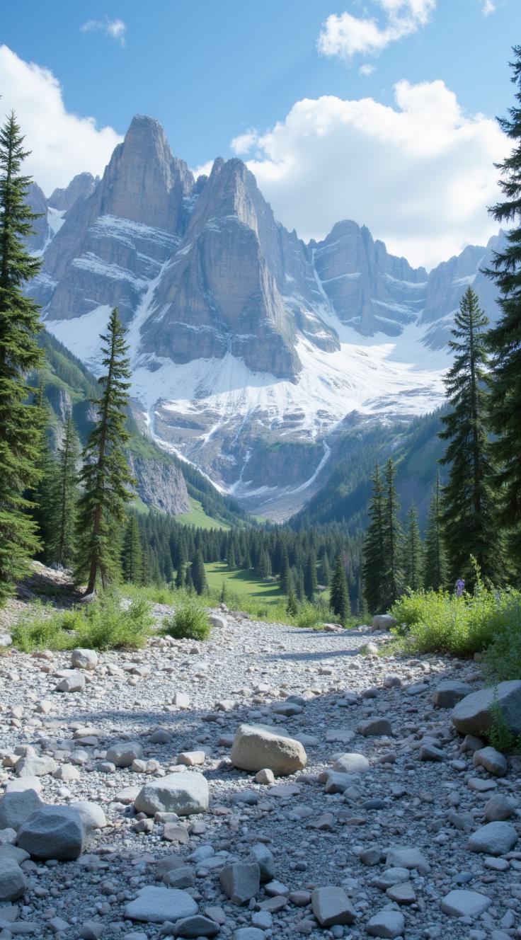 Фотореалистичная премиальная сцена среди скалистых гор. В центре композиции горная камянистая дорога слегка припорошеннная первым снегом ведет в горы. На заднем плане — горы. Вершины покрыты снегом. внизу зеленые ели. Фон — голубое небо и на его фоне горы и лес. Атмосфера динамичная, мощная, с акцентом на силу природы и премиальность.Освещение: дневной свет с контрастными холодными акцентами от снежных вершин и голубого неба, Высокая детализация,PBR-рендер уровня Octane/Keyshot, фотореализм. Формат: 8K,фотореализм, премиальный стиль.