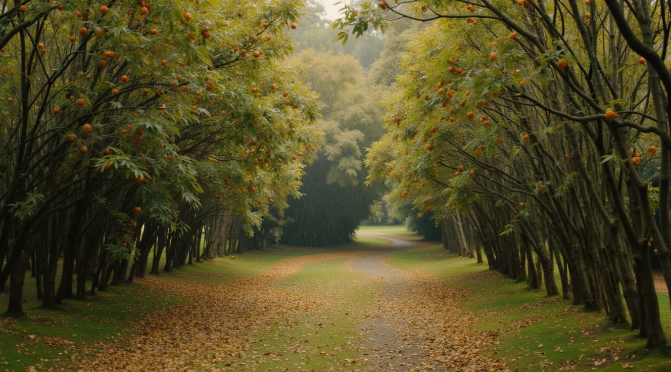 видео в кинематографическом стиле, камера не движется, в котором будет идти чуть косой дождь, в осенний сад по середине с узкой извилистой тропинкой. С несколькими деревьями с хурмой, на деревьях уже мало листвы, в основном плоды хурмы и яркие созревшие и еще желтоватые, земля почти вся усыпана мокрыми листьями упавшими с дерева и так же на земле разбросаны несколько плодов хурмы. чуть в дали под одним деревом стоит старая деревянная лестница и рядом с ней плетеная корзинка с сорванными плодами хурмы. Дует легкий ветерок и чуть колышет листву на деревьях.