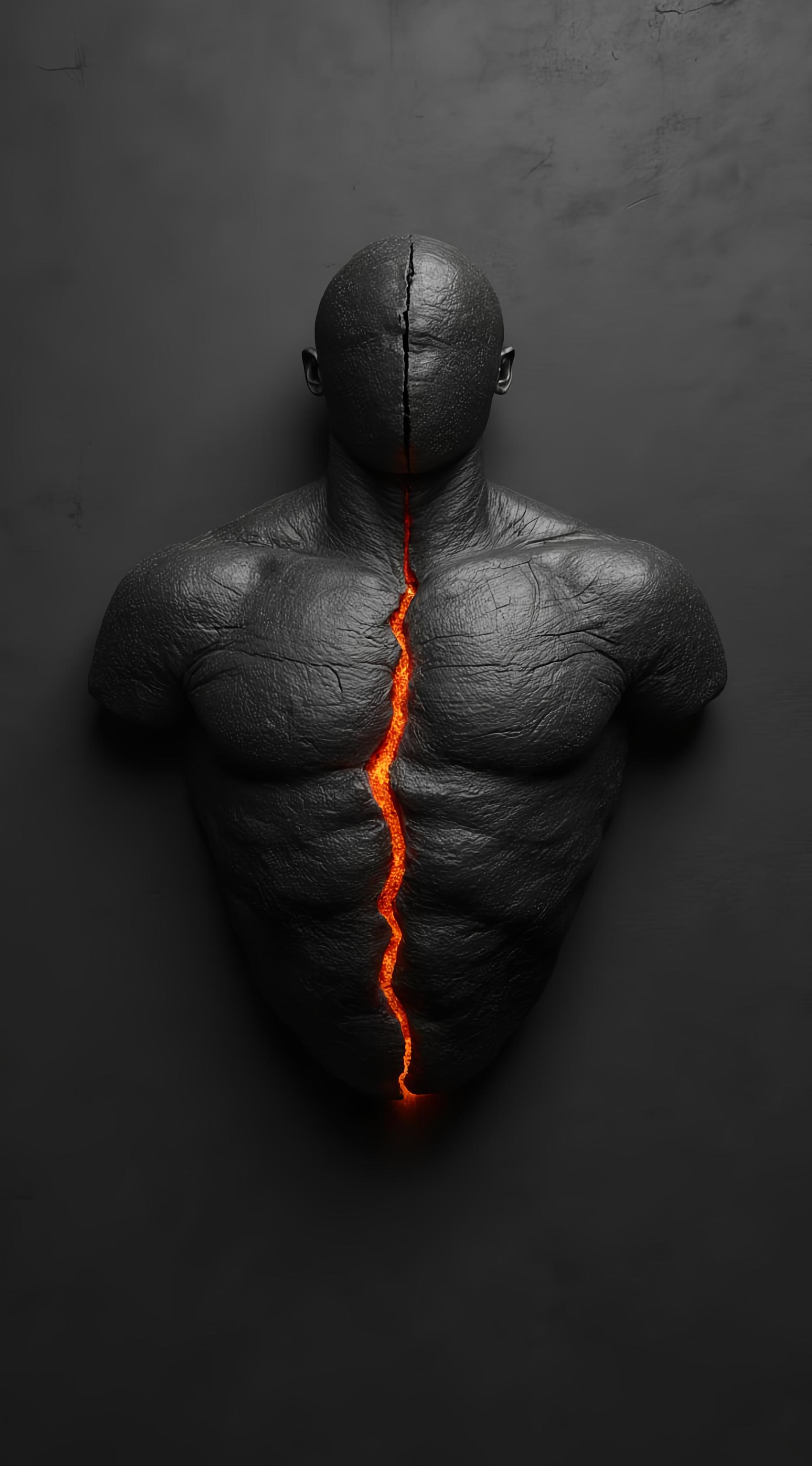 Минималистичная обложка книги в стиле инженерной графики в стиле киберпанк. Тёмно-серый фон, имитация бетона или гранита. В центре — стилизованное изображение человеческой грудной клетки, внутри которой вместо сердца — тёмно-серый камень с пульсирующей оранжево-красной трещиной. Камень выглядит тяжёлым, фактурным. Вокруг камня — едва заметные линии напряжения, как схемы перегрузки. Никаких людей, лиц, рук. Только метафора. Должна быть раскрыта тема гиперфокуса в СДВГ. Название: «Одиночество воина 2.0». Подзаголовок мелко: «Инструкция по выживанию». Никакой эзотерики, свечения, нимбов, абстрактной магии. Только камень, огонь, инженерия. Компьютеры хакеры,