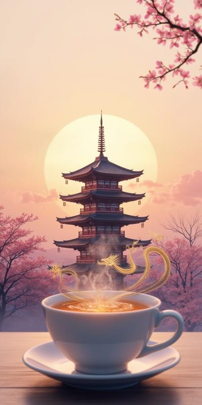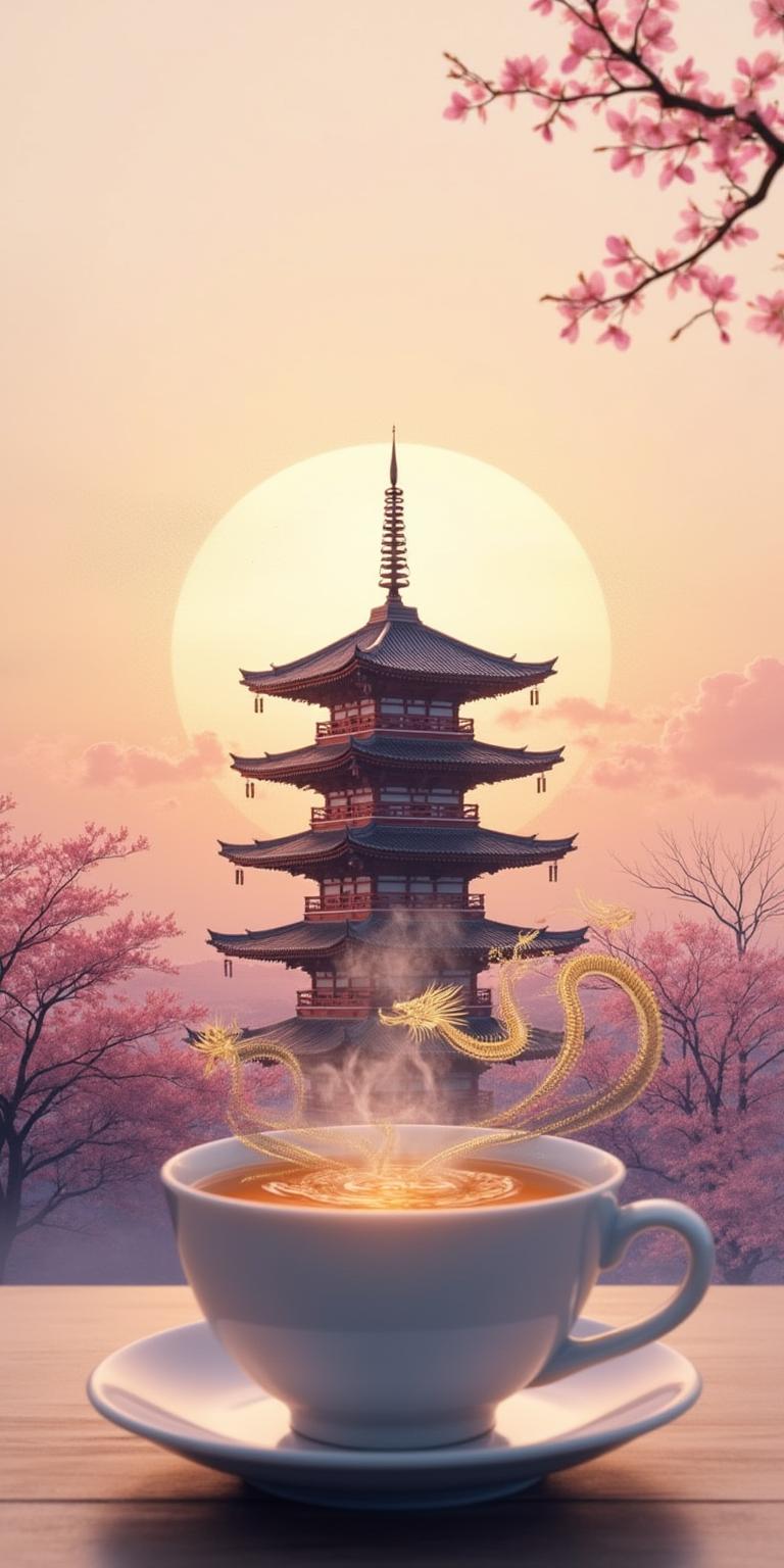 Создай видео в стиле микс восточной живописи тушью и цифровой акварели. На фоне градиента рассветных оттенков (нежно-розовый, золотистый, лавандовый) изобразь силуэт пагоды с бамбуком и ветвями сакуры. На переднем плане — дымящаяся чаша с чаем, пар превращается в золотого дракона, обвивающего мандалу. Рядом веер с иероглифами, на заднем плане — мерцающие фонарики. Внизу — волны узорчатого шёлка, в углах — стилизованные иероглифы. Используй пастельные тона с акцентами золота и киновари, добавь дымчатость и плавные переходы.