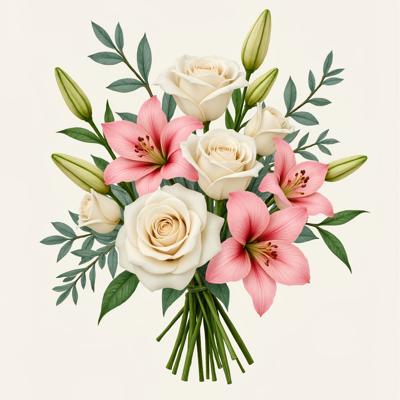 Изысканный нежный букет из белых эустом (лизиантусов) и розовых лилий. В композиции присутствуют розы сорта 'Мадам Бомбастик' кремово-белого цвета, добавляющие шик и объем. Зелень рускуса и эвкалипта. Пастельная цветовая гамма, мягкий фокус, натуральное освещение, акварельный стиль с детальной проработкой лепестков, эстетика романтики и нежности, букет для особого подарка, высокое разрешение