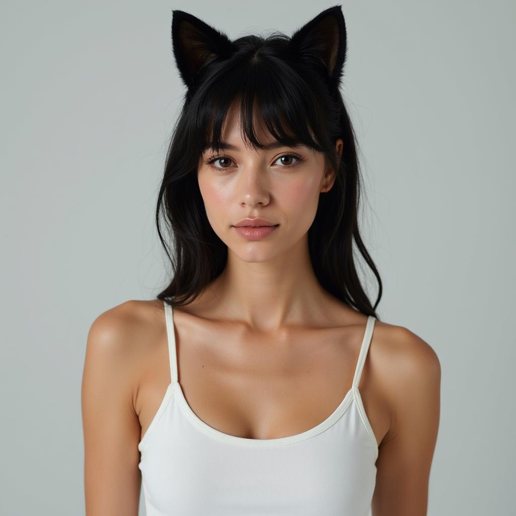 masterpiece, best quality, ultra realistic, photorealistic, 8k, a beautiful russian woman with black hair and cat ears on her head, standing straight, looking directly at the viewer, wearing a simple white tank top, waist-up shot, professional studio photography, soft lighting, sharp focus, detailed eyes, skin pores, cinematic,