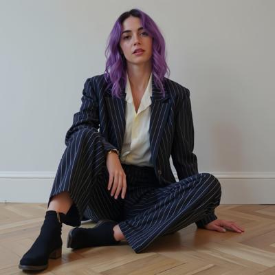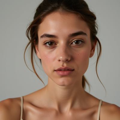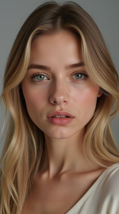 A highly detailed, realistic portrait of a 20-year-old Russian woman with delicate features, large eyes, and sensual lips. Her face is youthful, attractive, and sensual, with a relaxed expression, yet sentimental, with a touching expression, soft gaze, and gentle smile., Her hair is long, light, and wavy. Her eyes are blue., The woman sits elegantly., She wears a tailored white suit that seems to emanate a soft light., The woman's expression is calm and confident, looking into the camera. The background is a soft gradient of dark brown and light brown tones, creating a warm and inviting atmosphere.