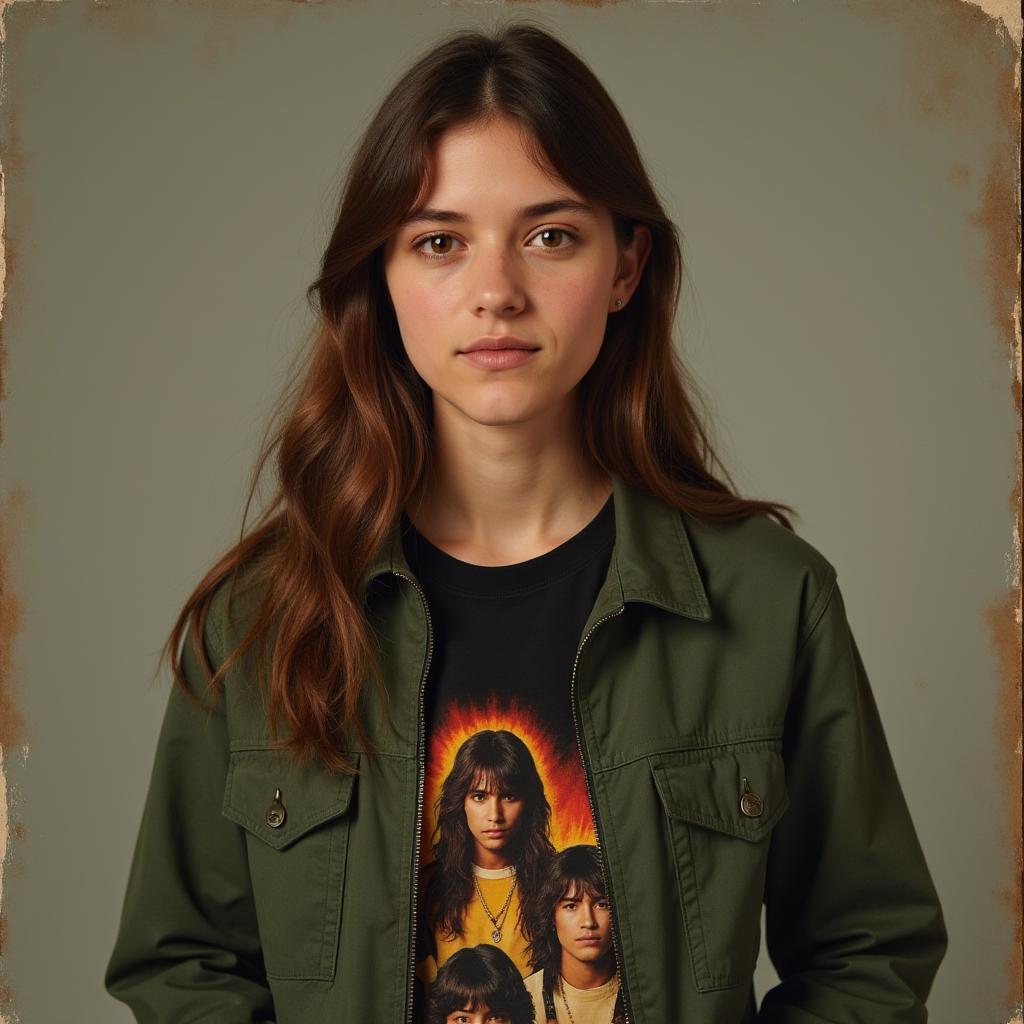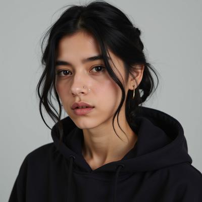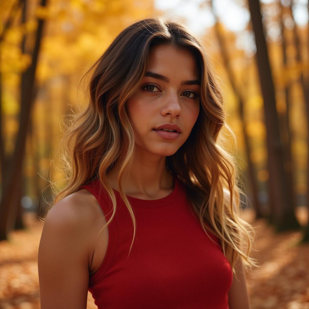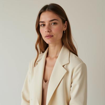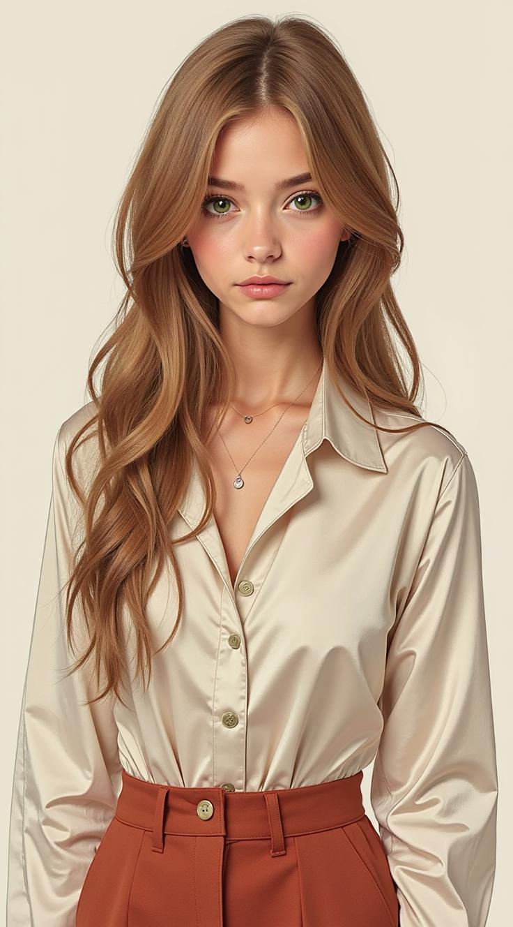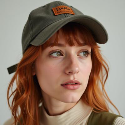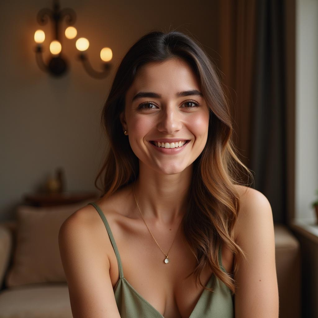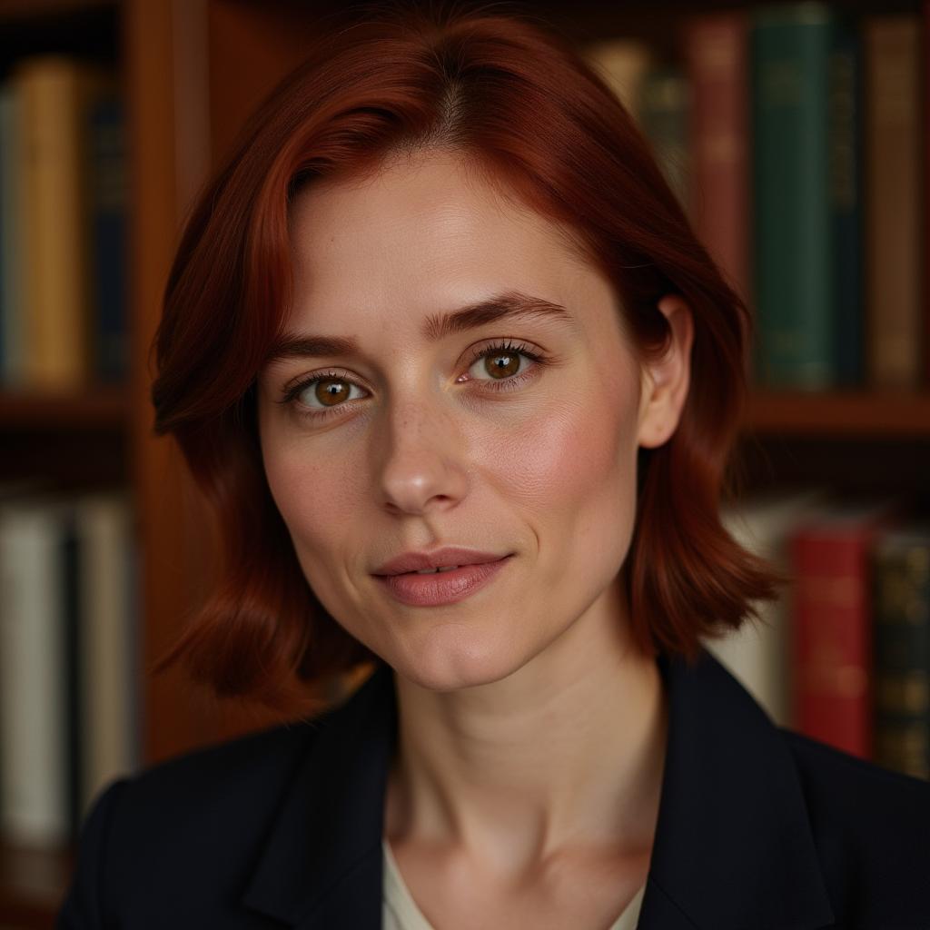 Портрет по пояс или по плечи. Женщина 30 лет с умным, спокойным, немного отстранённым взглядом. Темные волосы в рыжину. Немного морщин. Веснушки на лбу и щеках. Уверенность без надменности. Легкая, едва заметная улыбка в уголках губ, будто она знает интересный секрет. Фон размыт, но угадываются книжные полки или столик кафе с ноутбуком. Свет мягкий, боковой, подчеркивающий черты лица. Ничего кричащего, только качественные текстуры (кашемир, дерево, бумага).