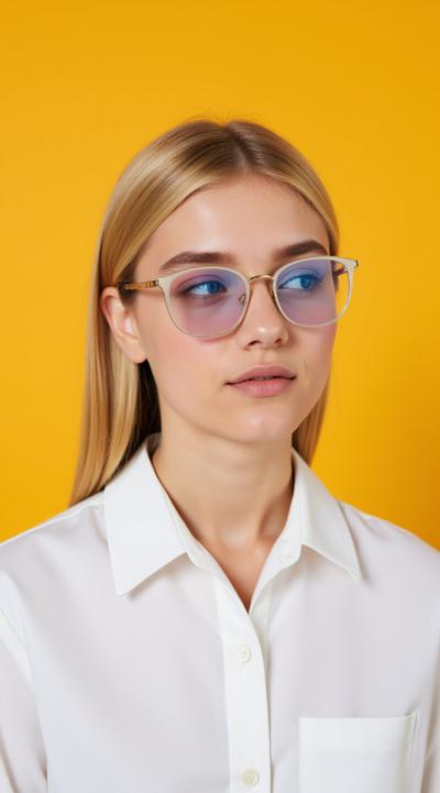 Фотографический поясной портрет молодой девушки с русыми аккуратно уложенными волосами на ярко-жёлтом фоне. На девушке белая классическая рубашка и очки со слегка затенёнными сине-голубыми линзами, через которые чётко просматриваются глаза. У девушки естественный повседневный макияж. В правой руке она держит соцветие брокколи возле своей головы. В левой руке на уровне диафрагмы она держит тарелку с салатом, слегка наклонив её в сторону камеры. Студийное освещение, чёткая проработка текстур, высокая детализация. Снято на портретный объектив, создающий качественный фокус на субъекте. Без изменений: ярко-жёлтый фон, позы рук, объекты в руках (брокколи и тарелка с салатом), цвет рубашки и очков.