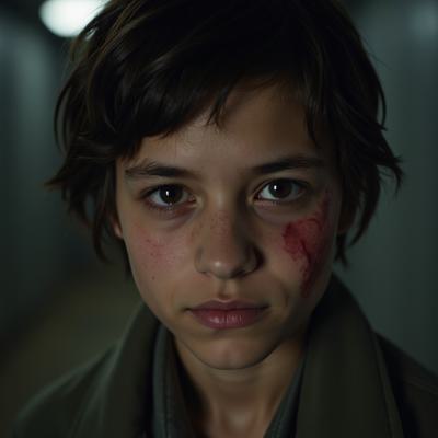 A 14-year-old girl survivor in a cold underground shelter after a nuclear disaster. Pale, thin, exhausted face, short uneven hair roughly cut near the right temple. The right side of her face has a healing burn scar from a nuclear flash two weeks ago — reddish skin, slight scarring and peeling. Her right hand is bandaged. She wears oversized worn winter clothes and a rough blanket over her shoulders. She sits quietly on a wooden bunk in a dim bunker room lit by a weak kerosene lamp. Her eyes are large, tired, frightened but determined. Cold damp concrete walls, post-apocalyptic realism, cinematic lighting, muted colors, dramatic shadows, highly detailed, photorealistic.