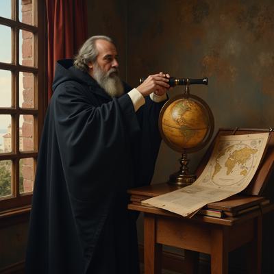 Создай изображение Галилео Галилея с седыми волосами и седой средней длины бороды в черном халате/мантии, находящегося в помещении с картами, глобусом, смотрящего в телескоп за космическими объектами в окно и изучающего спутники Юпитера. Фотография должна передавать реалии 16 века. На фото обязательно должен быть телескоп и то как Галилей смотрит в него, наблюдая за Юпитером