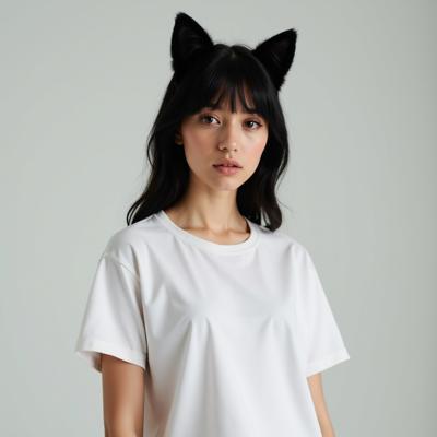 шедевр, лучшее качество, ультрареалистично, фотореалистично, 8k, красивая русская женщина с черными волосами и кошачьими ушками на голове, стоит прямо, смотрит прямо на зрителя, одета в простую белую майку, снимок по пояс, профессиональная студийная съемка, мягкое освещение, резкий фокус, детализированные глаза, поры кожи, кинематографичность,