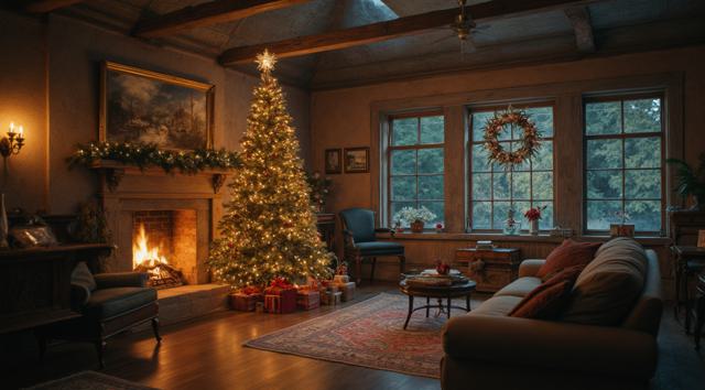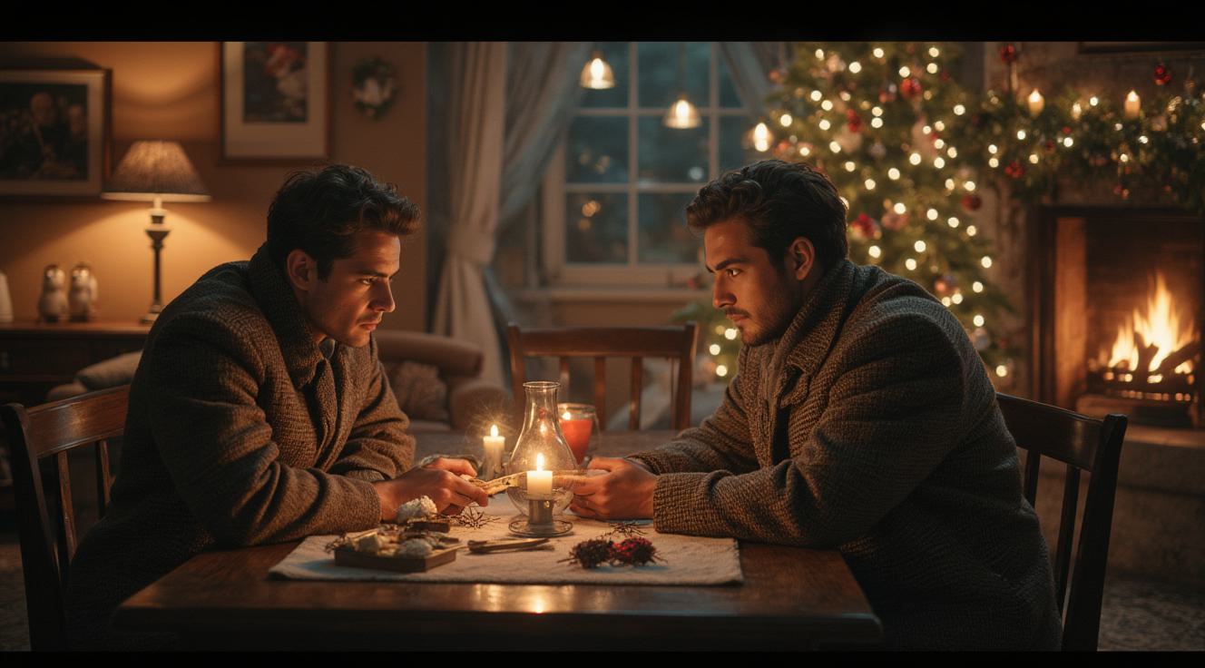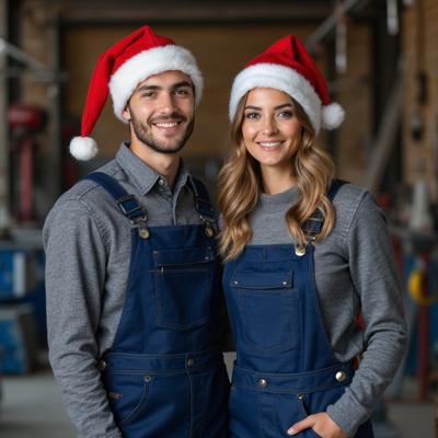 Профессиональная фотография, средний план. Молодые мужчина и женщина, рабочие, стоят рядом и радостно, искренне улыбаются, глядя прямо в камеру. Они одеты в парные однотонные синие рабочие комбинезоны из прочной ткани и праздничные красные колпаки Санта-Клауса. Снимок сделан в аутентичной мастерской с естественным дневным светом, заполняющим пространство. Фон — мастерская с инструментами и оборудованием — мягко размыт (боке), не отвлекая внимания от людей. Высокая детализация текстур одежды, кожи и плюшевых шапок. Теплая, дружелюбная атмосфера. Пленочная фотография, естественные цвета.