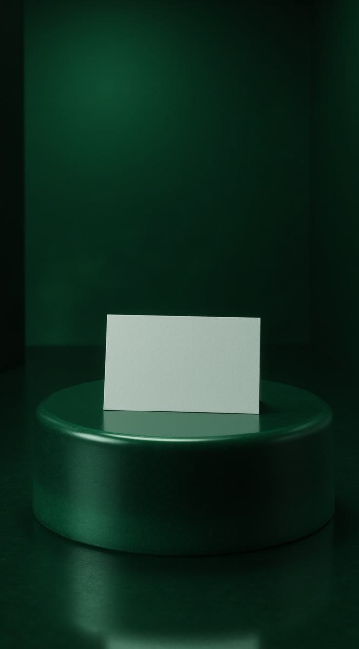 Создай мокап прямоугольной визитки. Визитка лежит на темно-зеленом круглом подиуме на темно-зеленой стеклянной поверхности, подиум подсвечивается снизу, создавая ощущение загадочности и шика. Изображение дает ощущение дороговизны, богатого антуража. Вокруг подиума - темно-зеленый стеклянный фон. Вид сверху. Приглушенные темные тона, атмосфера загадочная. Стиль минимализм. Средний план.