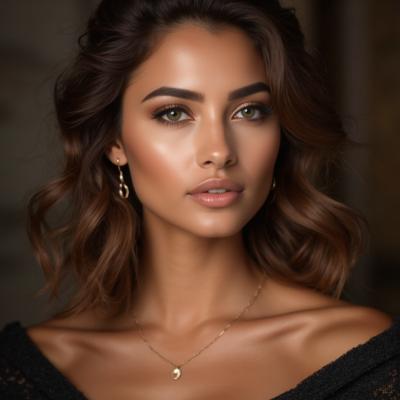 красивая очаровательная женщина,45 лет, лёгкий загар,интригующий взгляд,боб, кудри,зелёные глаза,яркий дымчатый макияж,очень-очень пушистые длинные ресницы,бронзово-бежевые тени на верхних веках,чёрная подводка,влажные розовые губы,глиттер,огромный пышный красивый бюст,маленькие серёжки и цепочка,в кружевном атласном топе небесноголубого цвета с блестящими нитями,HDR ,высокая детализация,проф.свет,профессиональная студийная фотография,гиперреализм, естественность,