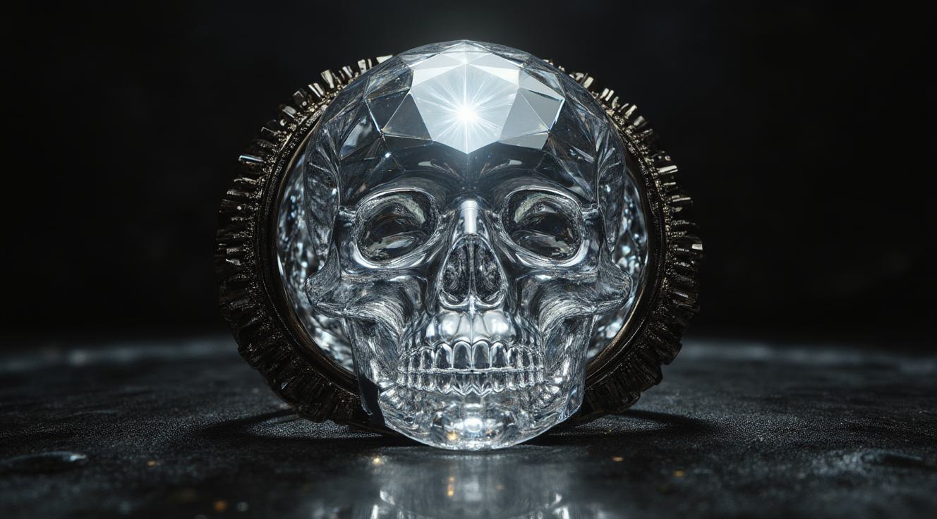 Обложка «КОДЕКС СУВЕРЕНА». В центре парит безупречный череп из прозрачного алмаза. Внутри него сияет ослепительная звезда — источник чистого белого света, заливающий грани холодным огнем. Череп окружен тремя кольцами: застывшая черная тушь, зеркальная сталь и золотой цифровой код 2026 года. Фон — абсолютная черная пустота. Свет исходит только изнутри черепа, создавая резкие контрасты на металле. Минимализм, гиперреализм, макросъемка, 8k