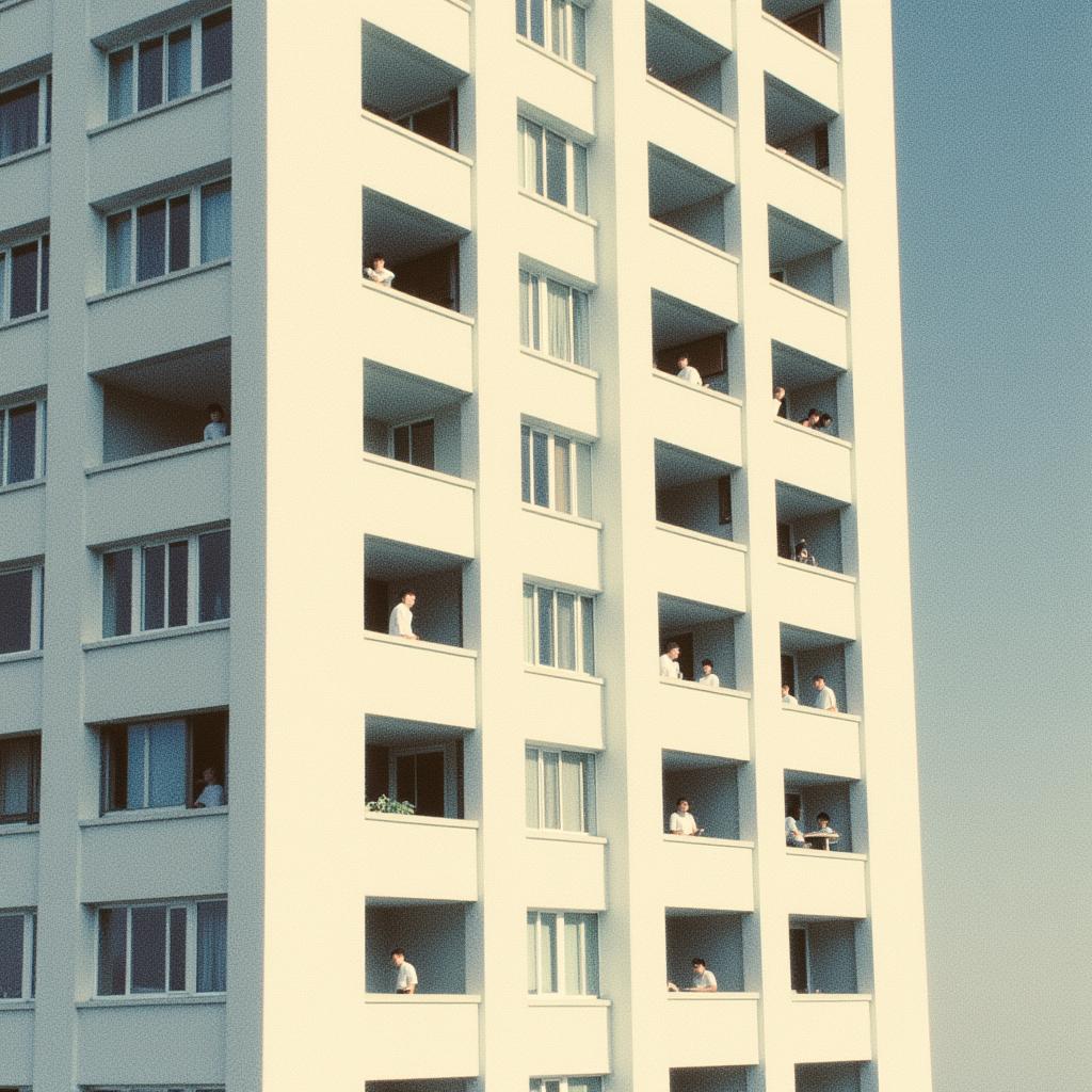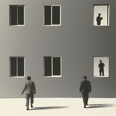 изобрази фасад типичной многоэтажки. Окна не темные, в каждом — монохромный силуэт, занятый своим делом (один танцует, другой читает, третий смотрит в окно). Их тени, отбрасываемые в общий двор, неожиданно взаимодействуют — танцующие тени берутся за руки, тень читающего человека соединяется с тенью другого, образуя мост.,