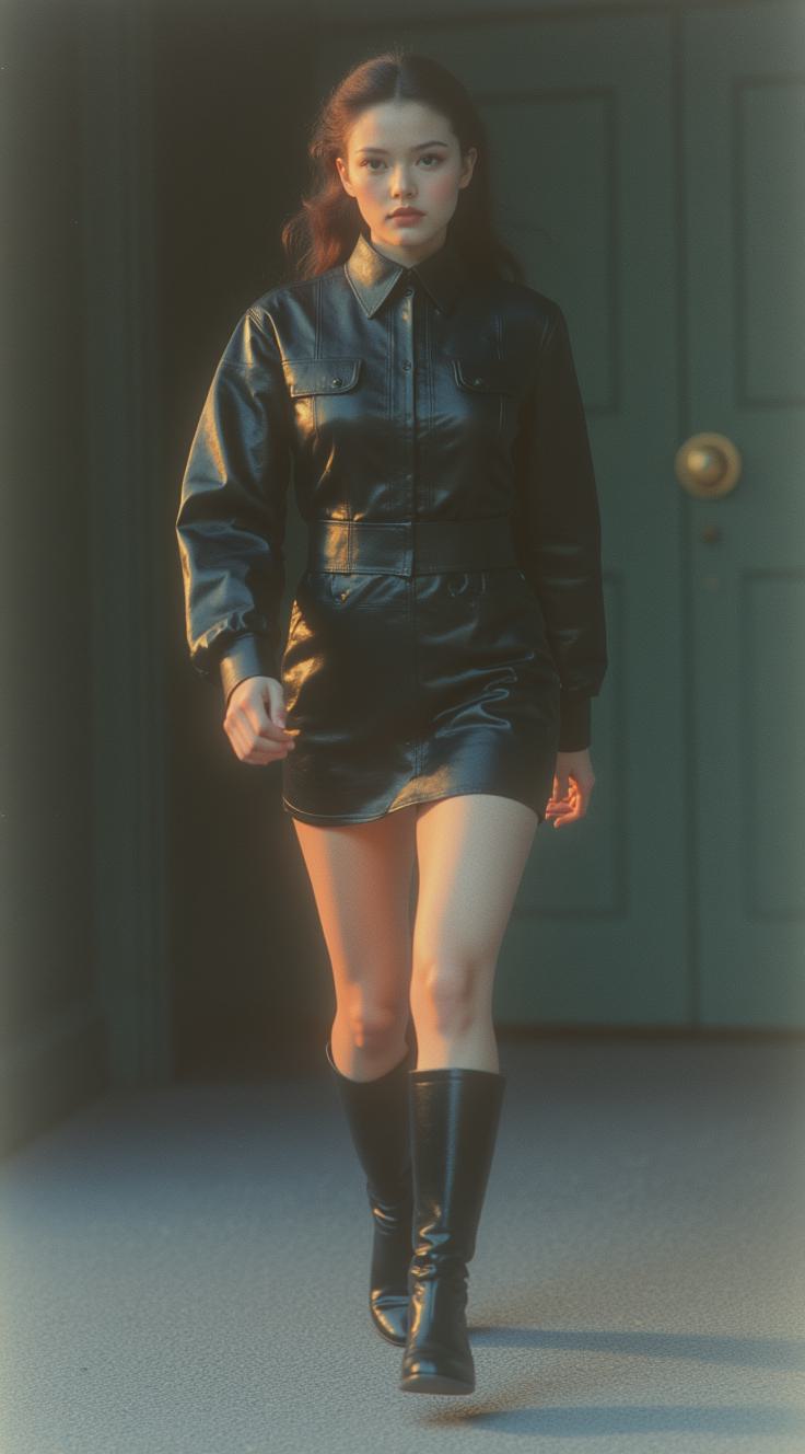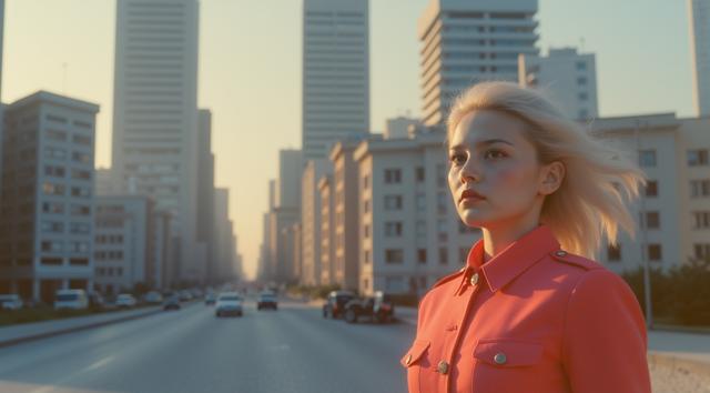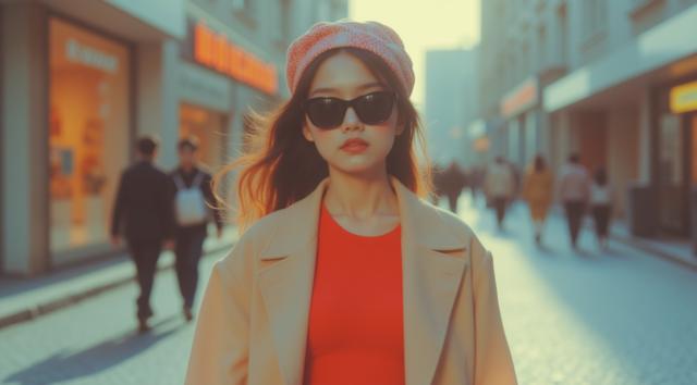стественное фото в стиле street-style настоящей брюнетки с шикарным платком на волосах, черными солнечными очками, в красном платье и бежевом пальто оверсайз, идущей по современному shopping-району. Размытие движения на фоне, резкий фокус на ней, естественный солнечный свет, фотореалистично, полный рост, детализированные аксессуары