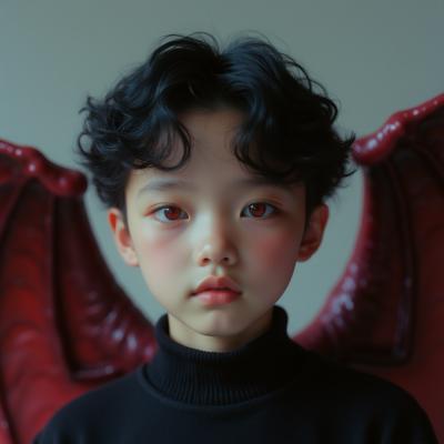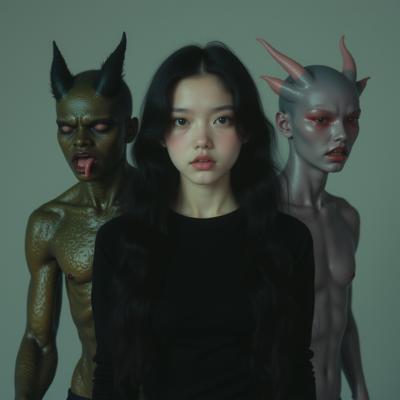 Девушка татарка с черными очень длинными волосами и каре-зелеными глазами стоит в черной одежде а за ней два демона. Один демон зеленый с широко открытой пастью и длинным языком с сумасшедшими глазами и длинными редкими волосами и рогами, а второй демон с накаченным серым накаченным телом, его кожа как потухшая лава, глаза красные и огромные величественные рога