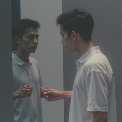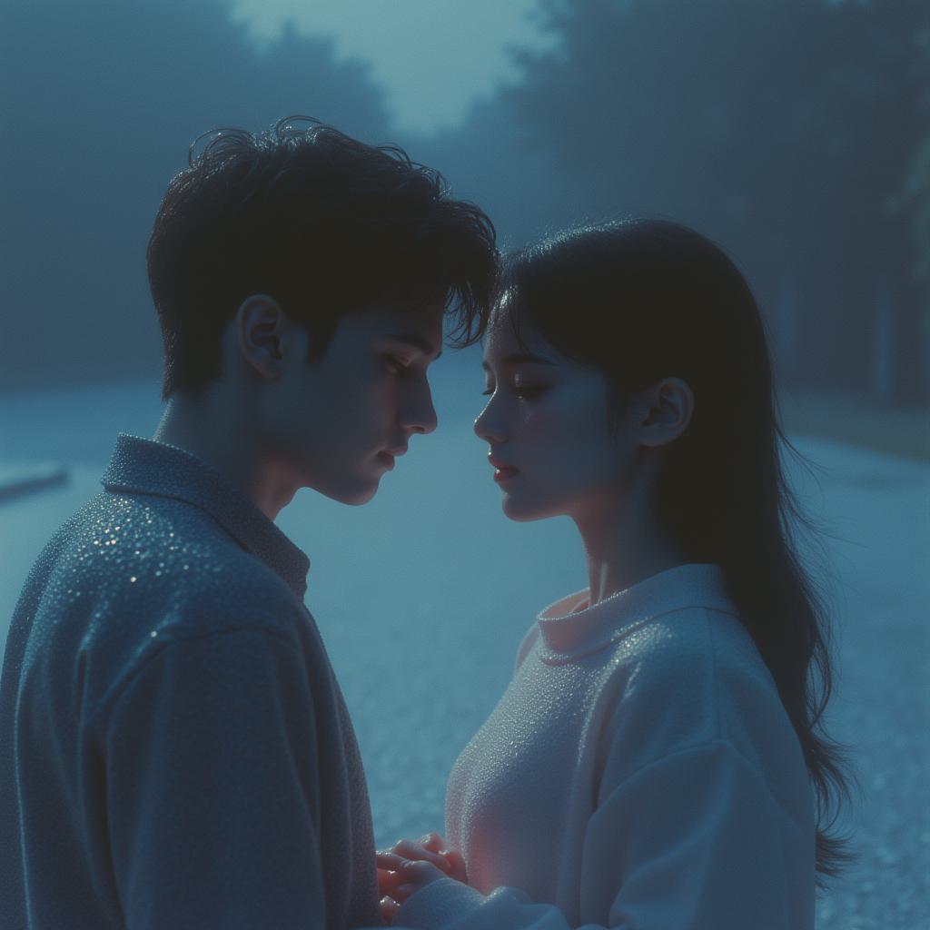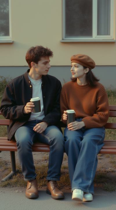 молодая пара, парень и девушка, студенты, им по 20 лет, на улице Санкт-Петербурга 2005 года, сидят на лавочке у дома и пьют чай из термоса, парень одет в черную куртку, джинсы и белую футболку, а девушка одета в коричневый свитер, джинсы и коричневый берет, у девушки короткие каштановые волосы до плеч, у парня короткие черные волосы
