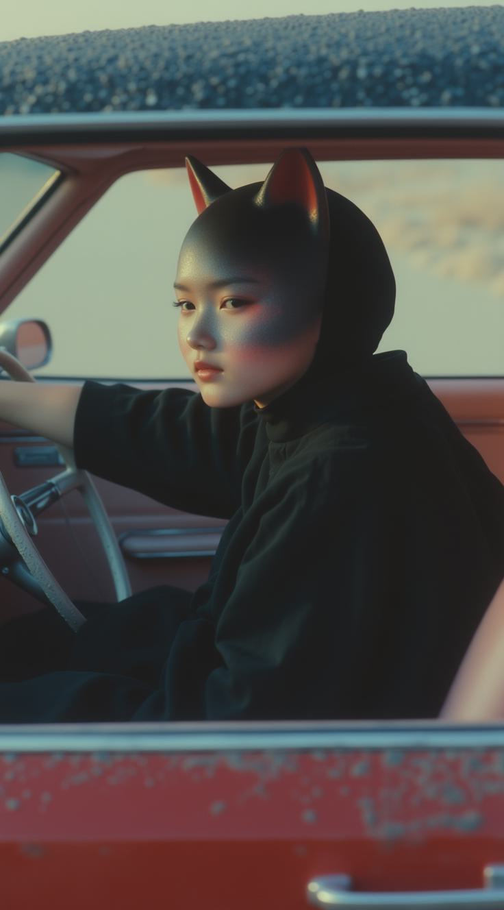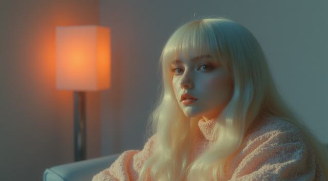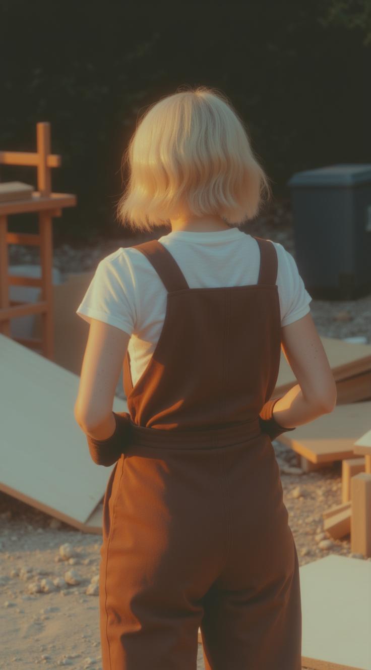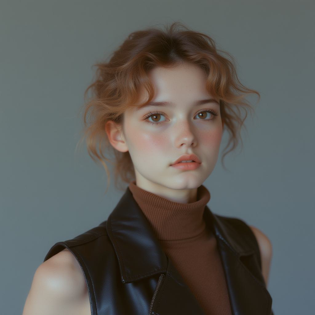Девушка на вид лет 18, светло русые волосы коротко подстрижены и находятся в творческом беспорядке, светлая кожа практически без румянца, глаза довольно узкие, темные, на веках черные тени и чуть поплывшая подводка. На ней надета коричневая безрукавная водолазка и длинная черная кожаная жилетка до бедра.