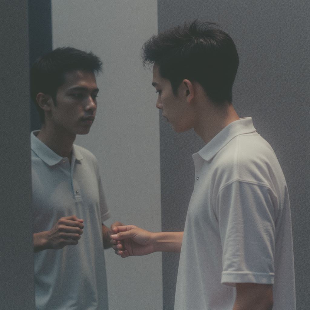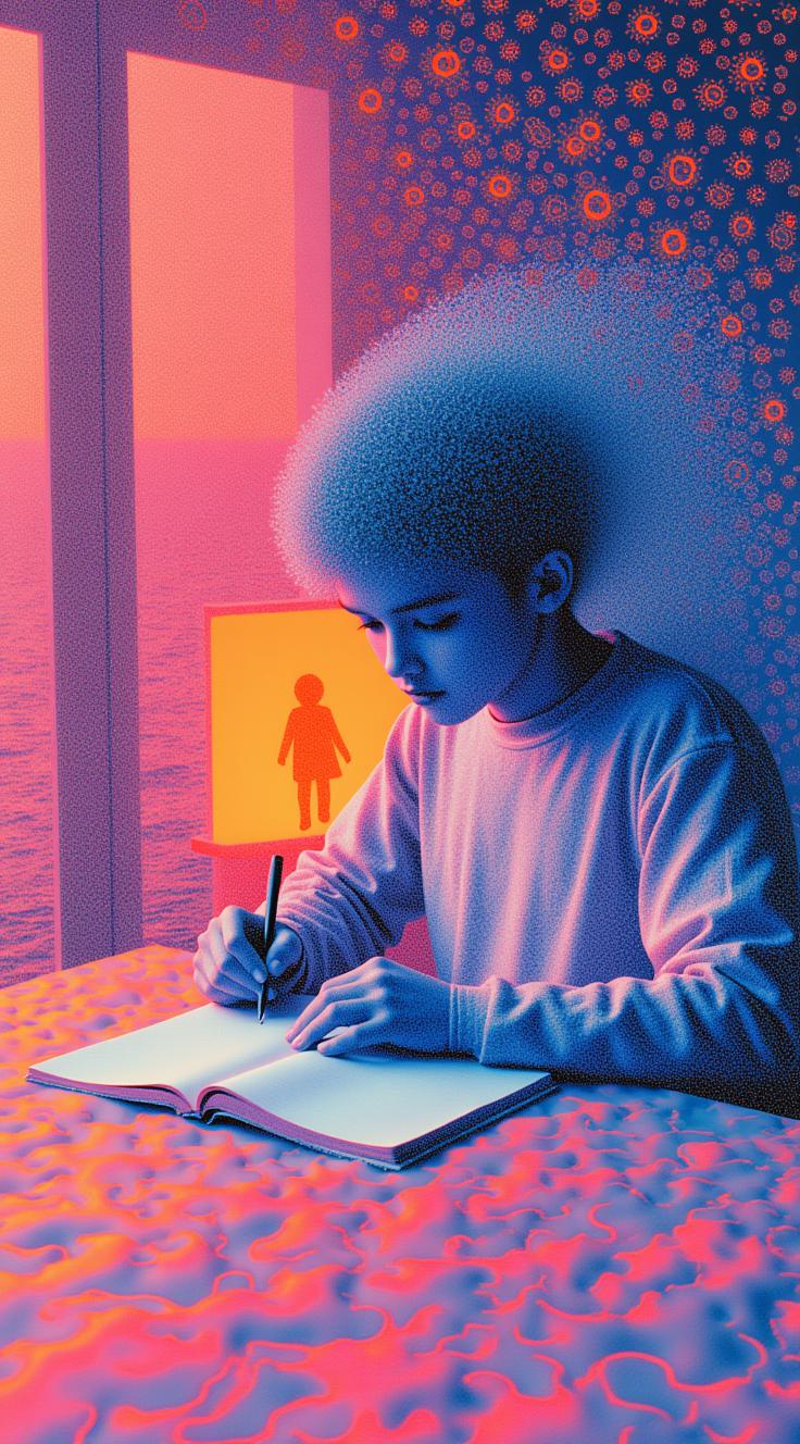 Психоделическая книжная иллюстрация в стиле нейрографики. Мужчина за столом пишет в тетради «Глава 44». От его головы расходятся разноцветные волны-спирали глубокого синего, фиолетового и золотого. Три женских силуэта растворяются в пульсирующих оранжево-розовых вихрях. Окно с морем искажено текучими линиями. Цвета: индиго для глубины, янтарь для тепла, бирюза для гипнотического эффекта. Мягкое свечение, плавные переходы, завораживающая перспектива, успокаивающая динамика. Атмосфера транса и погружения.