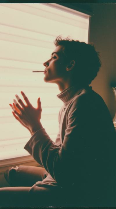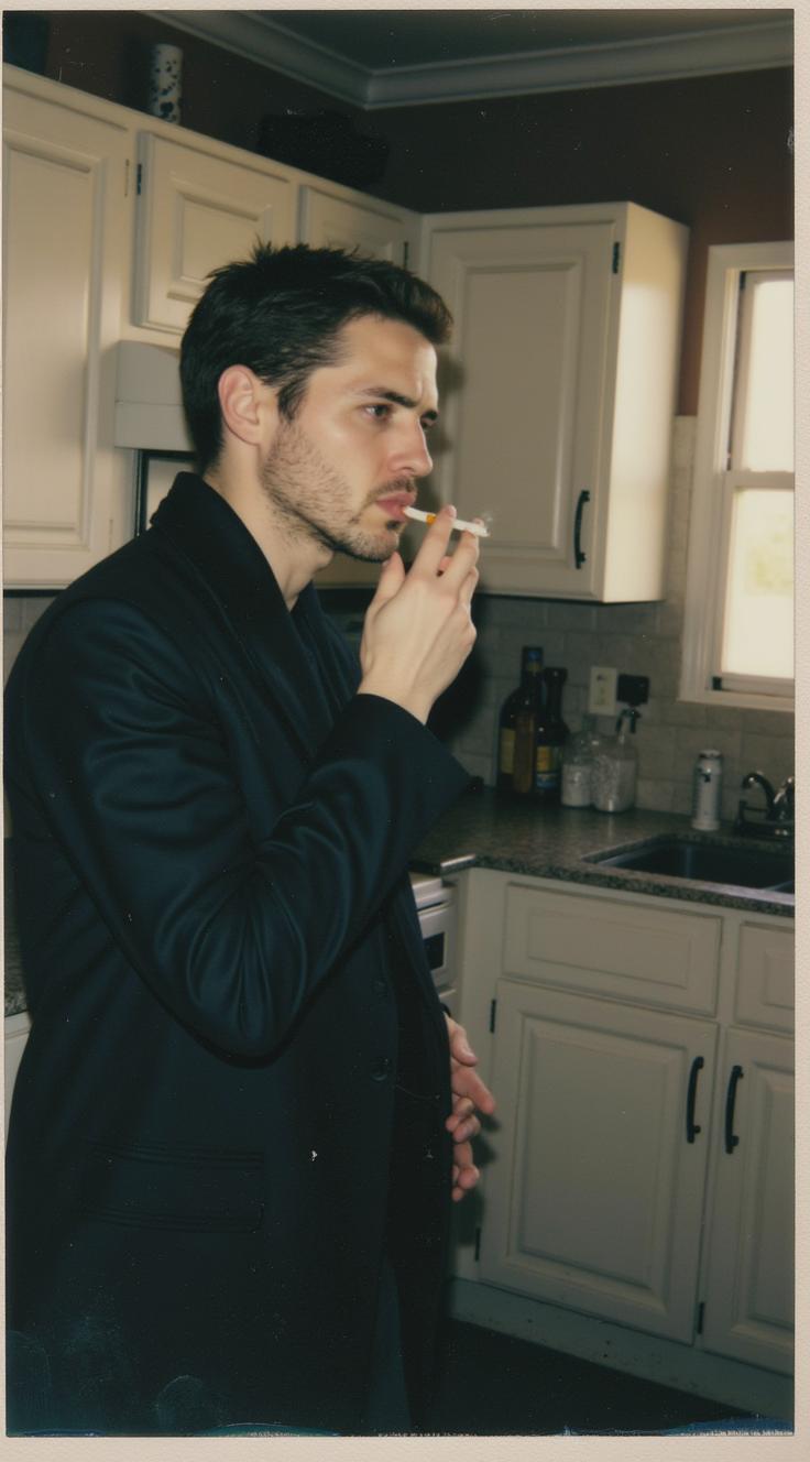 Молодой Парень с мешками под глазами уставший грустный в чёрной шапке в кожаной чёрной куртке в джинсах на ногах conversallstars красные держит в руках сигарету выдыхает дым, сидит на скамейке во дворе тускло светит на него фонарь, ,Между панельных домов, Снова хотел прожить этот день, его допить до конца, Жаль, там не было твоего лица, Просто гулял по старым дворам, и детство вспоминал, Я верил и ждал, Если наступит пора уезжать, Из города ночью, как вор, Загляни в старый детства наш двор, Там, на скамье ты встретишь меня, Мы сядем и выпьем вина, Ну, привет, ну, пока