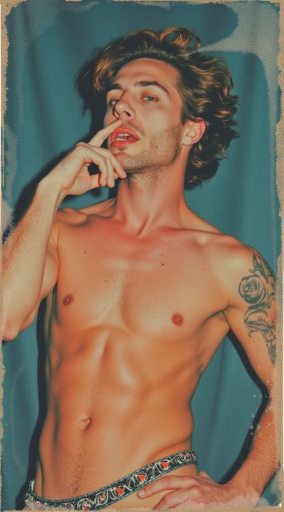 Изящный парень с red кожей. Пухлые губы, большущий рот, улыбка, длинные ресницы, синие глаза. Эстетика мужского тела, , узкие стринги. Интересная поза. грезы. сюреализм абстракция коллаж наложение слоёв. горячий батик. Fantasy. Стиль art nouveau. циан. синий. бордо. оранжевый. золотая пыль. стиль Yoshitaka Amano, Egon Schiele, Luis Royo, Гюстав Моро. в руке ёлочный шарик, на фоне наряженная ёлка. Красивая акварель по мокрой бумаге