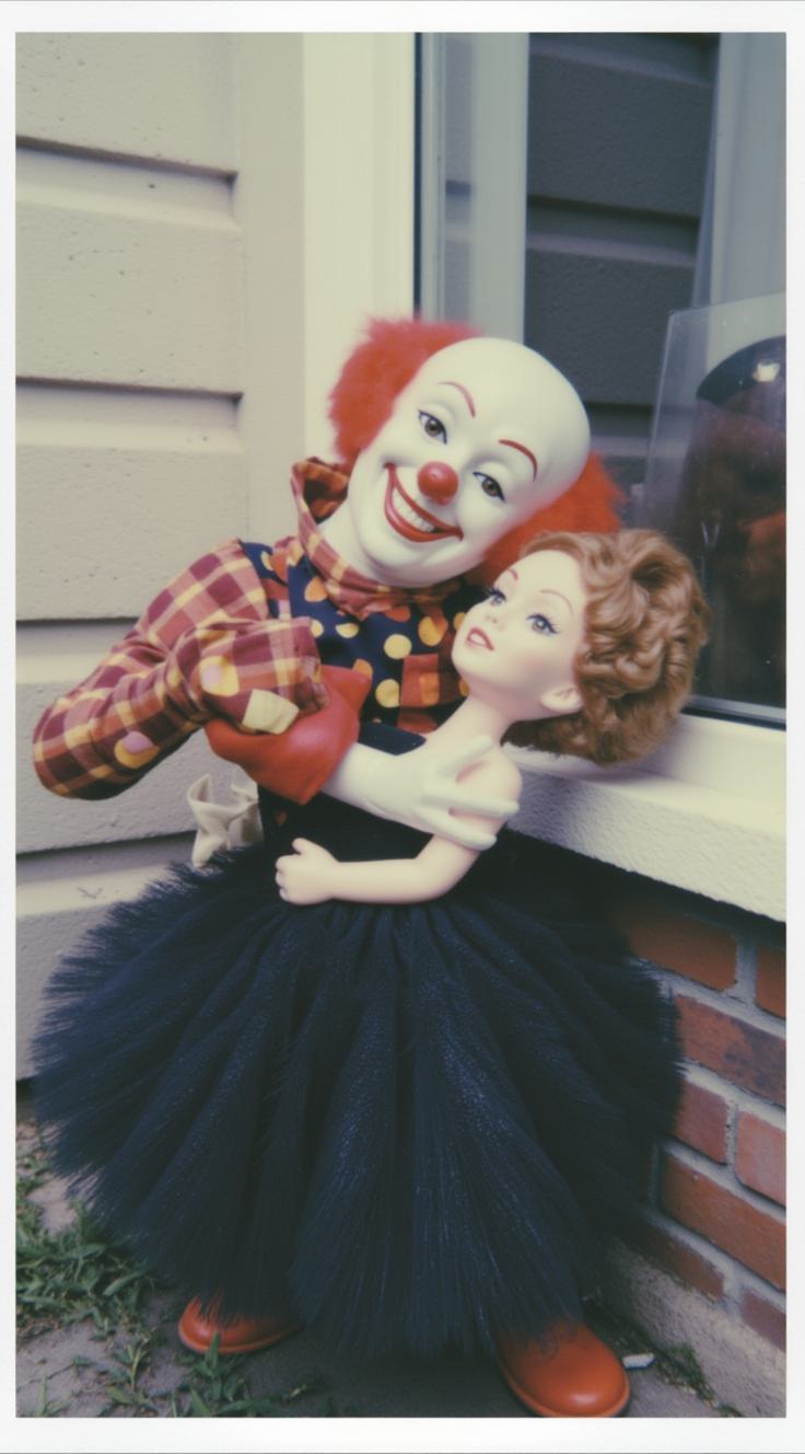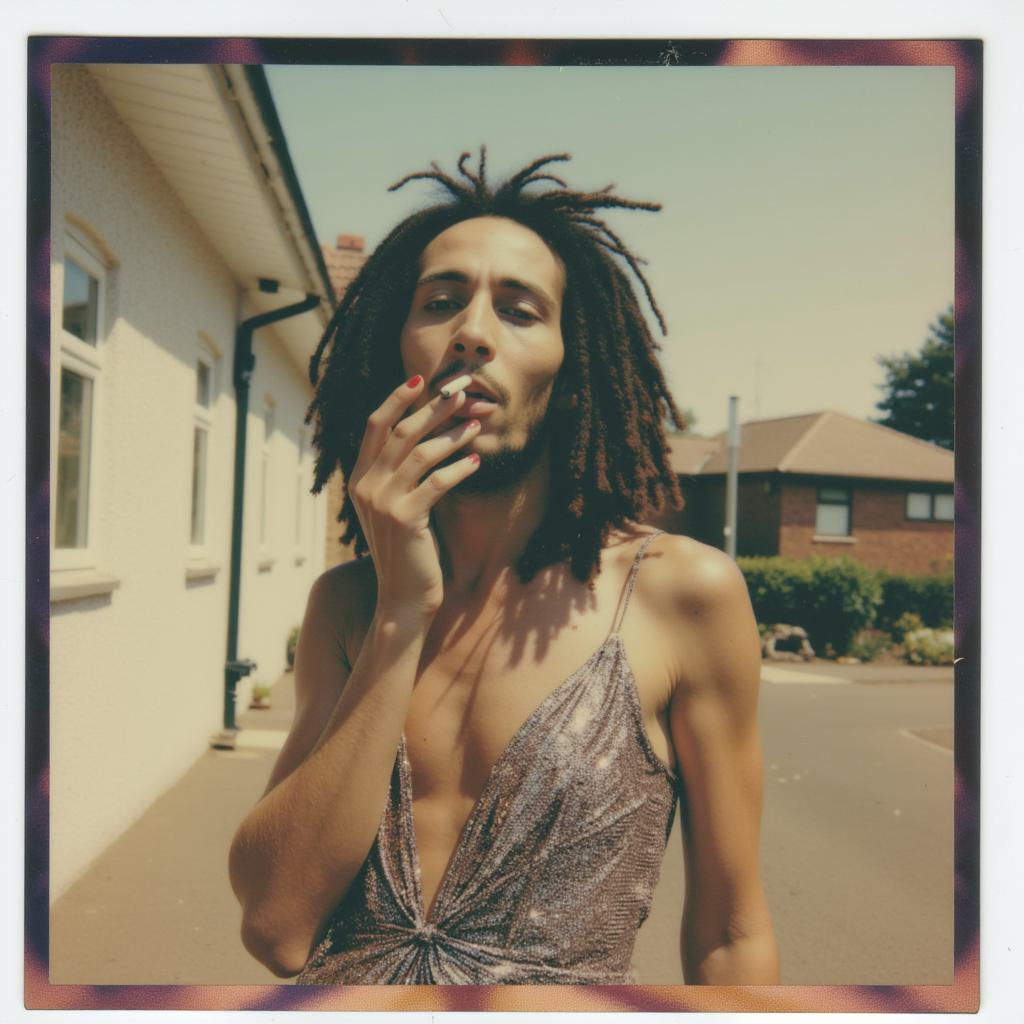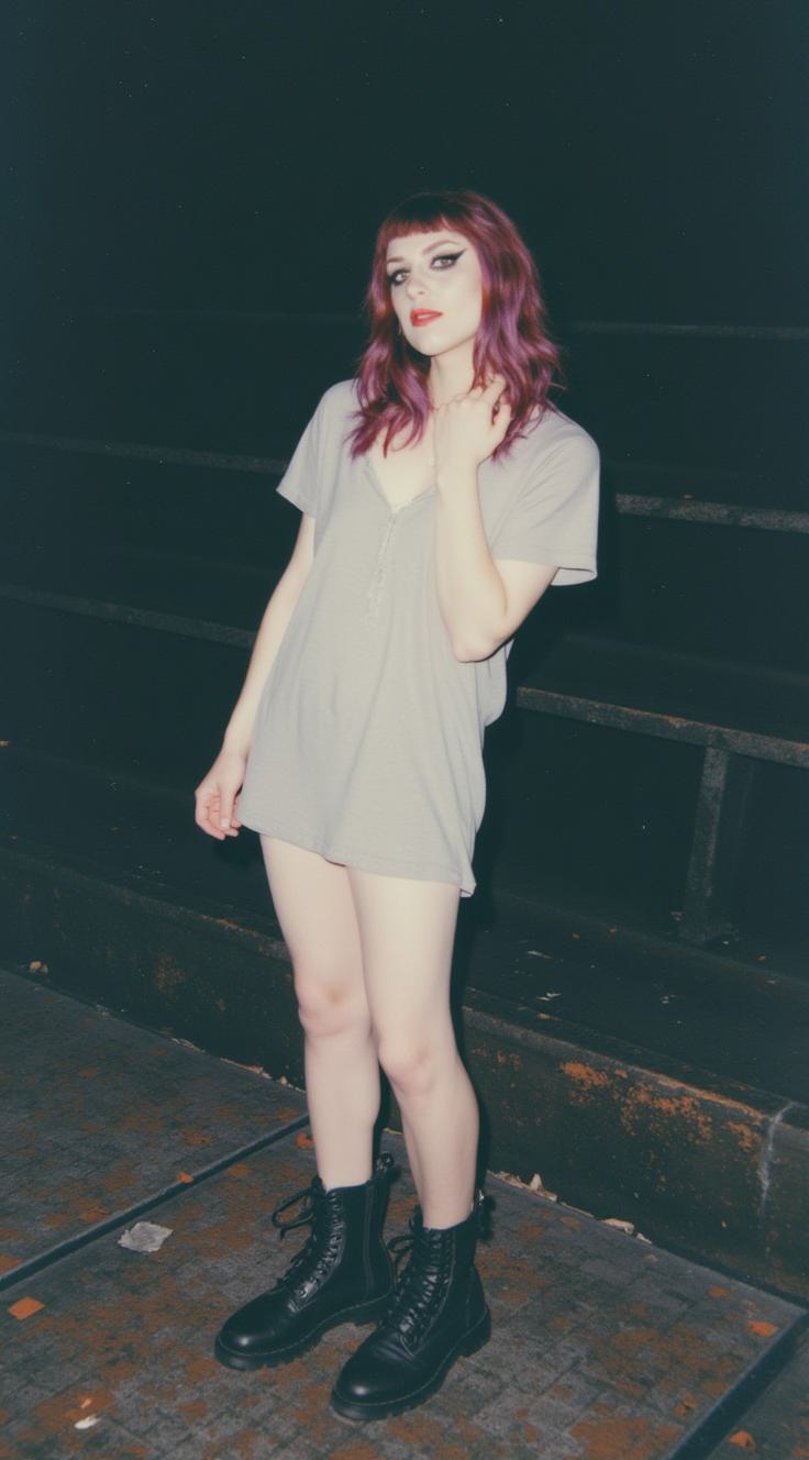 Реалистичное фото, утро после дикого панк-концерта в старом ДК. На пустой сцене стоит молодая альтушка, едва держится на ногах, пошатывается. Грязные красно-фиолетовые волосы спутны, на лице «шлюший» макияж: жирная черная подводка размазана до ушей, помада размазана. Она в тяжелых стоптанных берцах, рваных колготках и помятой мини-юбке. Вид экстремально неопрятный, потный и помятый. Вокруг пустые банки, окурки, провода и мусор. Тусклый свет из пыльных окон, в воздухе висит дымка. Атмосфера маргинального андерграунда, эстетика «грязного реализма», эффект снимка на старую мыльницу, зернистость, вспышка в лоб, суровый русский панк-рок вайб