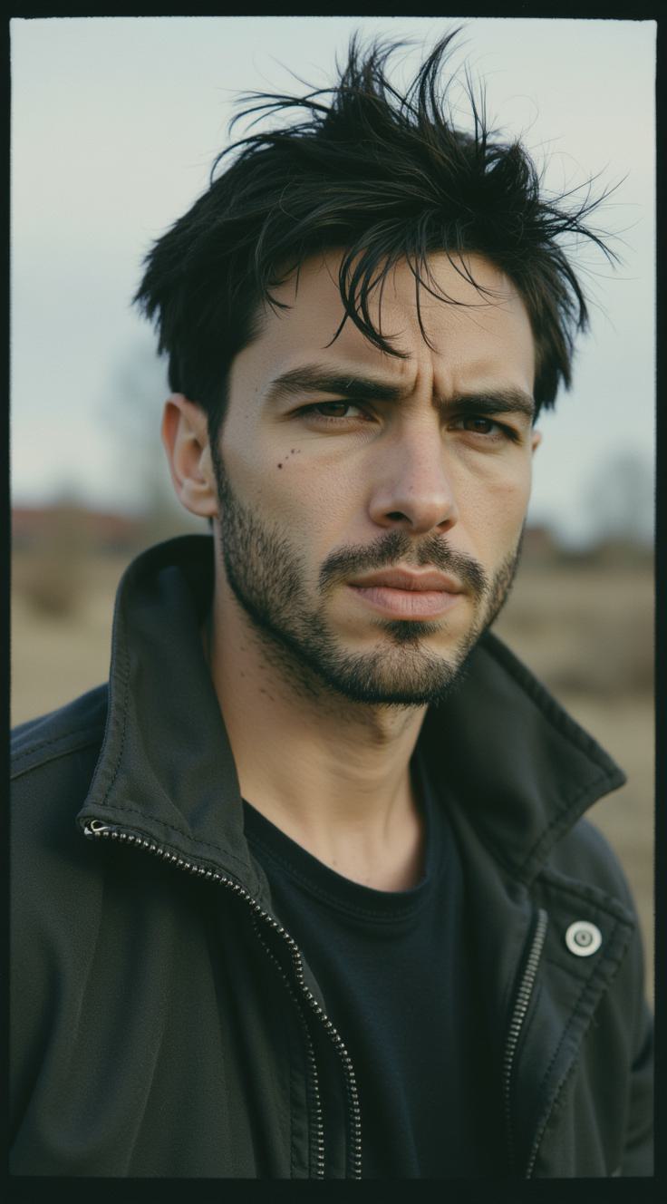 RID, 22 years old, post-apocalyptic survivor. Tall, muscular, broad shoulders, strong intimidating physique. No beard, clean-shaven. Sharp angular face with a scar on cheekbone. Dark, almost black eyes — intense, obsessive, slightly unhinged look. Messy dark hair falling over forehead. Worn black clothes, leather jacket, combat boots. Stands with threatening tension, hands clenched. Looks dangerous, possessive, mentally unstable. Alone in abandoned building interior, dim light from broken windows, dust particles in air. Dark atmosphere. Full body shot.