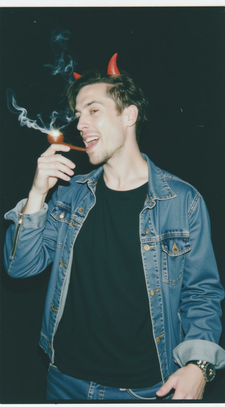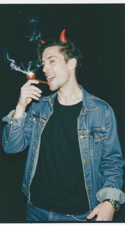 Парень Мефистофель рога ростут из-за лба ,растрёпанная прическа панк в джинсовой желетке чёрной майке улыбается изо рта и носа много дыма,челкает пальцами ,огонь из пальцев искра в другой руке курительная трубка в полный рост в джинсах и красных кедах convers allstars, Из пальцев выбил искру, чтоб трубку смолить , Мне по нутру, Цветы подполить, Богряный закат, Окутает алым мой взор, Не смог устоять ,я - звездопад, Ты назовёшь это кринж, а для меня это вкусный позор, Повторить не сможет никто, Как летаю сейчас и раньше летал, Из десяти выбил сто, И если Поднялся - значит уже не Упал