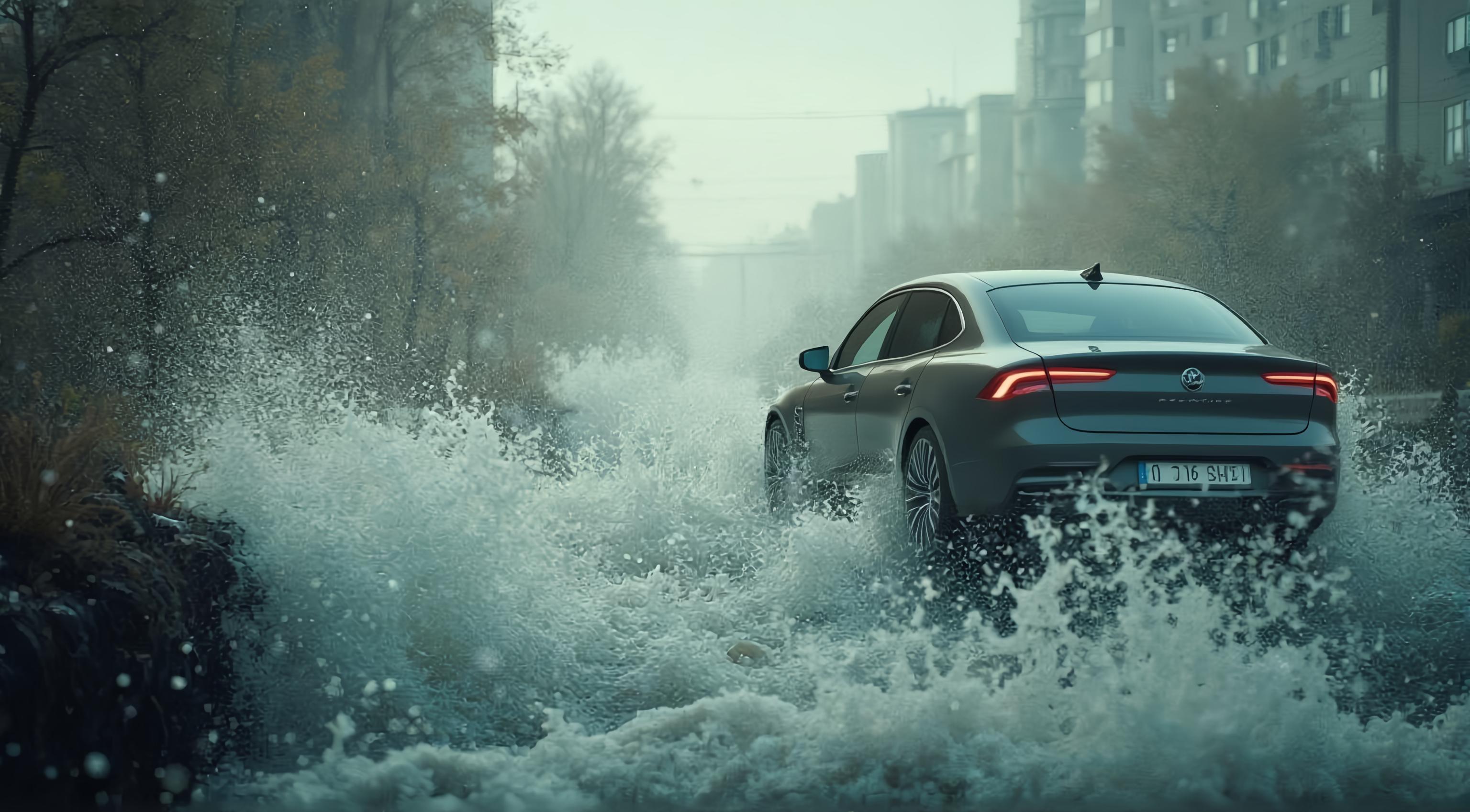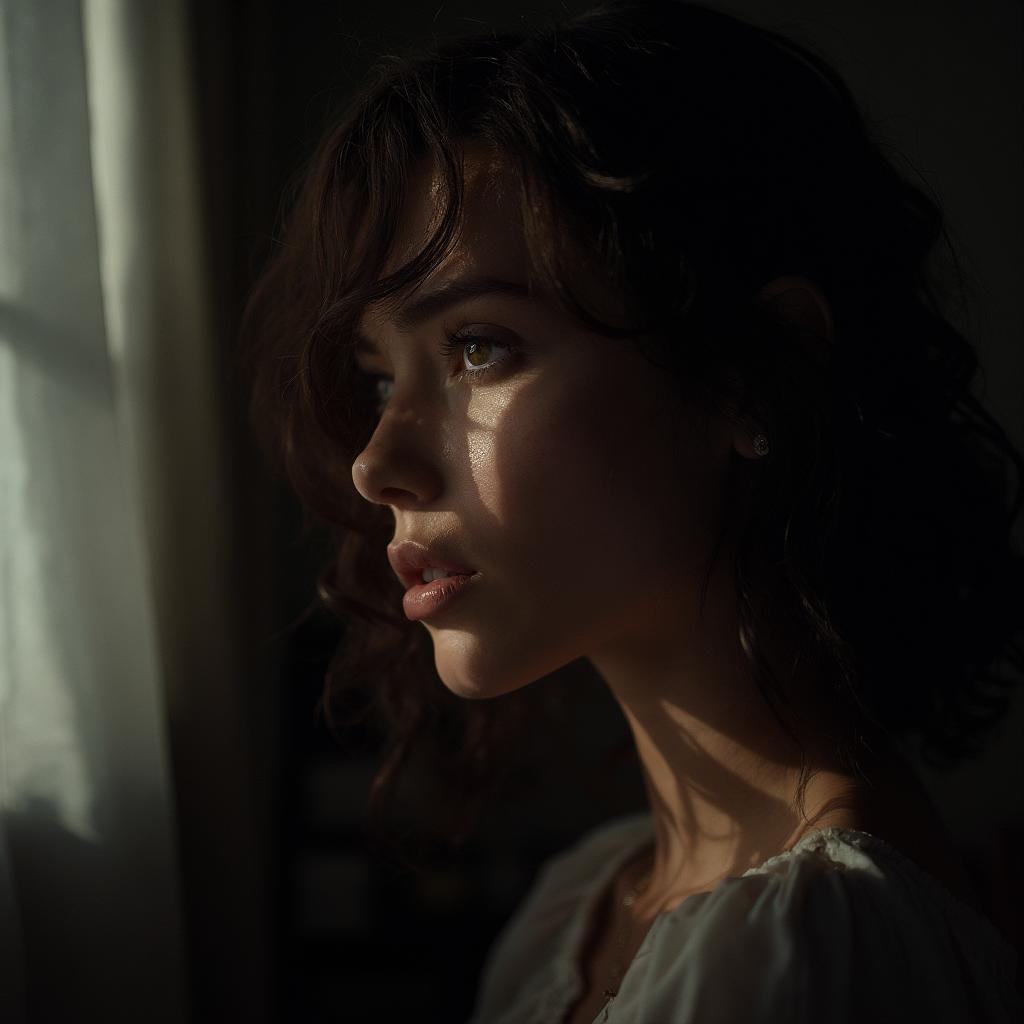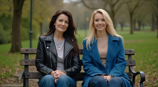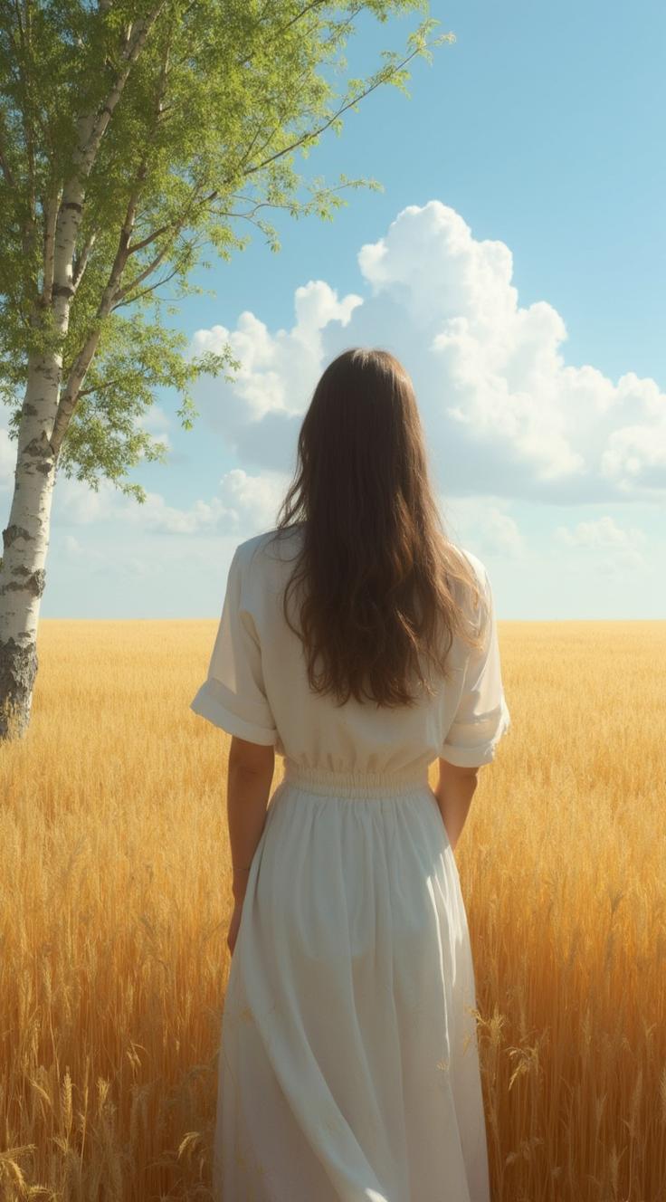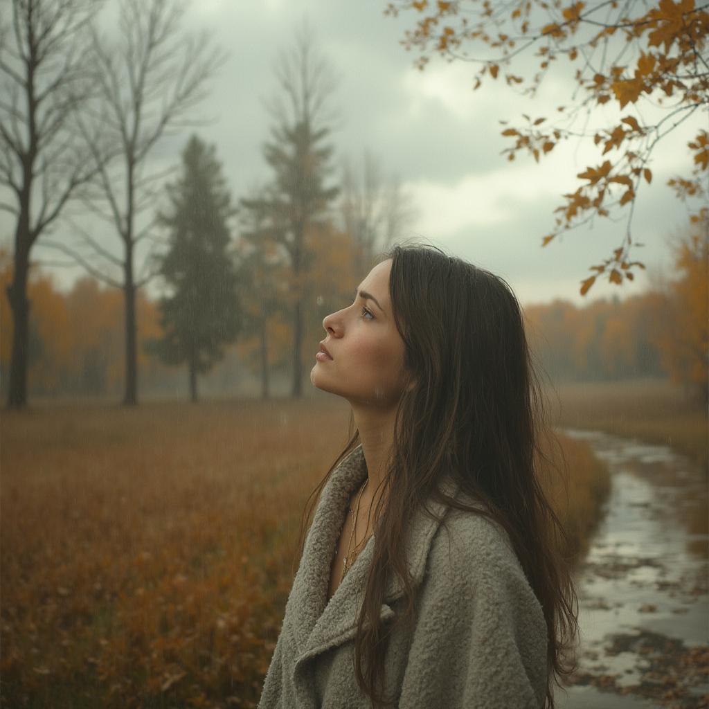 "Осенняя сцена с золотой листвой. На переднем плане — молодая девушка с распущенными волосами, на щеках у нее слезы. Она стоит под дождем или рядом с каплями дождя, которые падают вокруг. В небе — тучные, серые облака, медленно плывущие по небу. В фоне — мягкий, размытый пейзаж с деревьями, усыпанных золотыми и оранжевыми листьями. Атмосфера немного грустная и тёплая одновременно, с ощущением надежды и ожидания скорой встречи."
