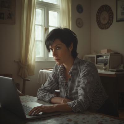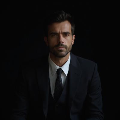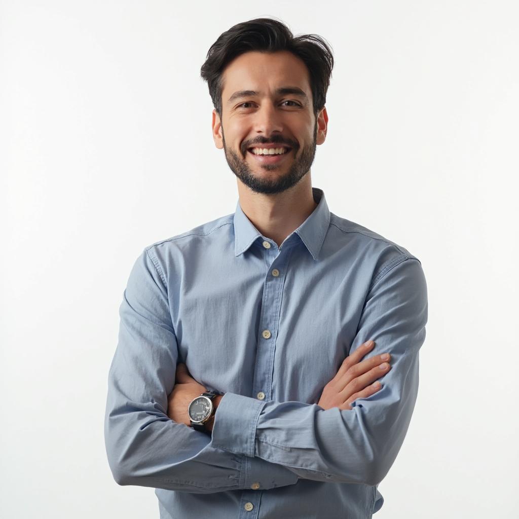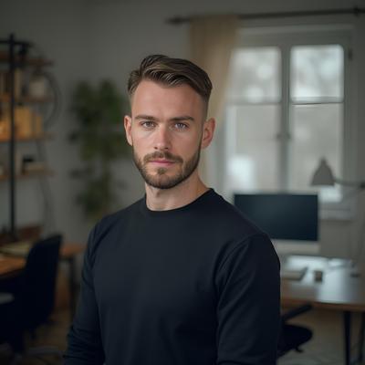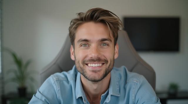 естественный свет, равномерное освещение, на лице нет теней. Реалистичный портрет молодого мужчины-спикера, ведущего онлайн-занятие. Изображение должно быть максимально реалистичным. Эксперт сидит слишком близко и его голова обрезается краем кадра сверху. Нейтральный фон, аккуратный, без отвлекающих деталей.