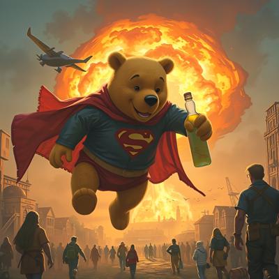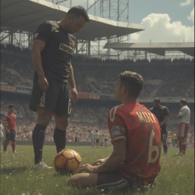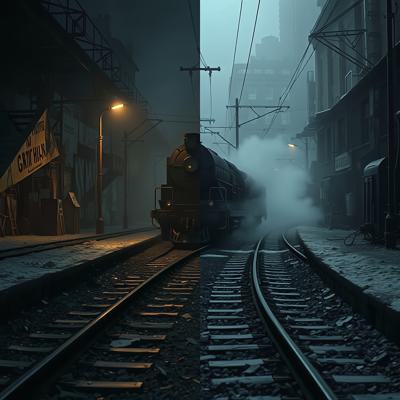 В центре локомотив стоит на железнодорожных путях, лицом к зрителю. Слева: Темная, разрушенная железнодорожная платформа ночью. Одинокий мерцающий фонарь отбрасывает беспорядочные тени. Грязные, рваные банкноты разбросаны по земле и платформе. Атмосфера запустения и упадка. Справа: Яркая, чистая и современная железнодорожная платформа при дневном свете. Хорошо одетые, счастливые и разнообразные люди, улыбаются и разговаривают. Атмосфера надежды и процветания.