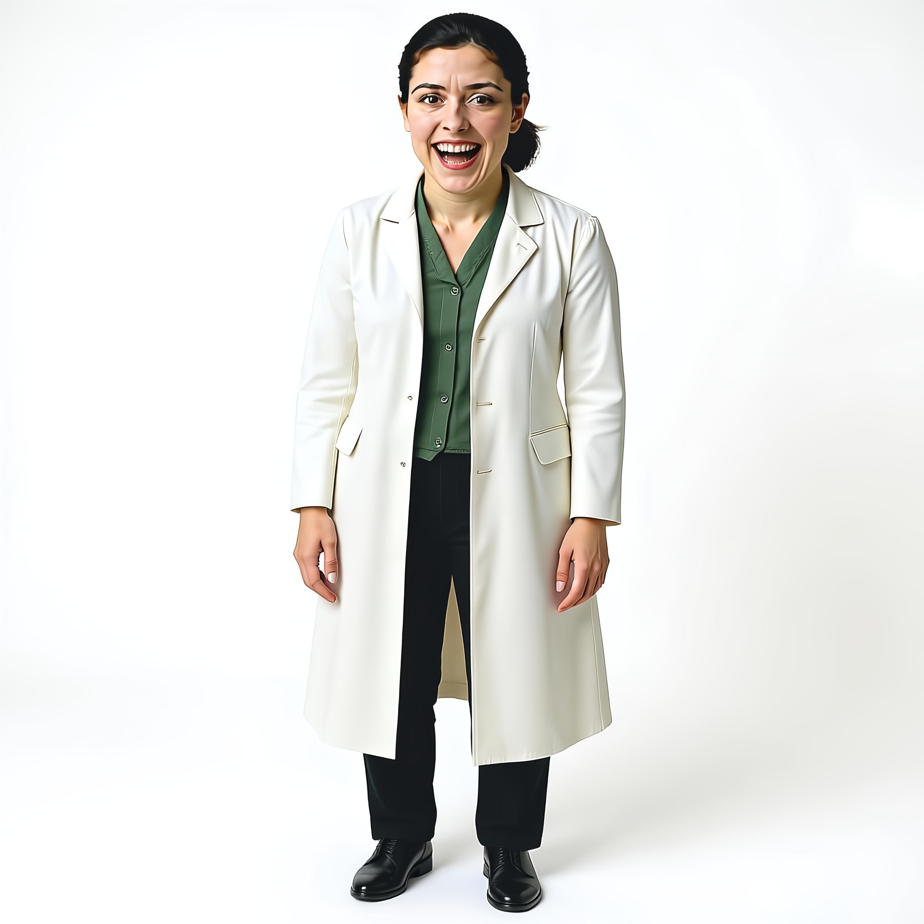 Нарисуй женщину 38 лет, не старую, но очень некрасивую, неухоженную, с тяжелым грубым лицом, тощую, сутулую, с плохой осанкой, в халате лаборанта. Не нужно рисовать Усов или лишних морщин. Просто некрасивая женщина - тяжелая нижняя челюсть, маленькие глаза, длинное некрасивое лицо с грубыми чертами. +Уточнение: Сделай её моложе! Ей 38 лет. Убери миловидность. Тяжелое лицо, некрасивое, маленькие глаза, массивная нижняя челюсть. . +Уточнение: Добавь сходство с Сарой Джессикой паркер. Нужна женщина 38 лет - то есть не старая, но некрасивая . +Уточнение: Сделай более светлые глаза, волосы - длинные убранные. Возраст младше, ей 38 лет. Но некрасивая. . +Уточнение: Волосы убраны в кичку. +Уточнение: Волосы убраны в кичку. +Уточнение: Изобрази её в полный рост на белом фоне. Она в белом халате. . +Уточнение: Изобрази её в полный рост на белом фоне. Она в белом халате. . +Уточнение: Нарисуй этого персонажа по пояс в радостном изумлении