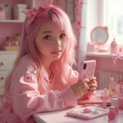 A stylish 16-year-old girl with bubblegum-pink hair streaks and glitter eyeliner poses with her Hello Kitty-encased iPhone beside an open cosmetics bag on a vanity table, surrounded by pastel lip glosses, pearl eyeshadow palettes, and heart-shaped brushes in a sunlit dressing room adorned with Sanrio wall decals and neon "Kawaii" signage, morning light reflecting through heart-shaped mirrors to create playful bokeh effects across the pastel pink backdrop.,