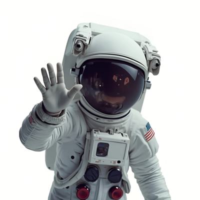 Кадр в стиле Кубрика из "Космической одиссеи 2001 года". Экстремальный крупный план на шлеме космонавта, в визоре которого отражается огромный, геометрический корпус корабля. Космонавт поднимает руку в приветствии. Минималистичный дизайн на чистом белом фоне. PNG, изолировано на белом, высокий контраст