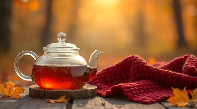 Стеклянный чайник с горячим черным чаем, стоящий на деревянной поверхности. Рядом лежит красный вязаный шарф. Вокруг разбросаны осенние листья жёлтого и оранжевого цвета. Тёплый, мягко размытый фон с оттенками осеннего леса — оранжевый, красный, золотой. Атмосфера уюта, тепла и осеннего спокойствия. Реалистичный стиль, мягкое освещение, высокая детализация, фокус на текстурах стекла, ткани и листьев.
