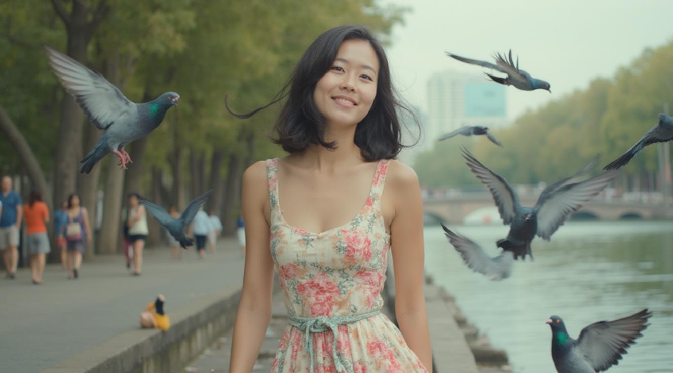 Завязка: Молодая японская туристка, назовем ее Акико, приезжает в жаркий российский город. Она надела легкий, ярко-цветочный сарафан, ожидая расслабленного отпуска, но совершенно не подозревает о предстоящих "приключениях"., , Смешные моменты:, , 1. Встреча с голубями: Акико пытается покормить голубей на площади, но вместо грациозного кормления, голуби устраивают "налет", и ей приходится смешно убегать, размахивая руками и придерживая сарафан.