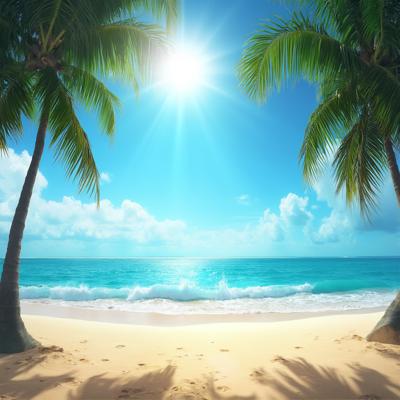 Создайте изображение идеального летнего дня на пляже. На картинке должно быть яркое солнце, высоко в небе, с лучами, отражающимися в лазурном море, где нежные волны накатываются на золотистый песок. Пляж должен быть окружен высокими пальмами с зелеными листьями, которые слегка колышутся на ветру. Включите отдыхающих: пару, играющую в волейбол, детей, строящих песчаные замки, и людей, лежащих на шезлонгах под яркими зонтиками. Добавьте детали, такие как пляжные полотенца с яркими узорами, ведерки и лопатки для детей, а также прохладительные напитки в руках отдыхающих. Пусть зритель почувствует тепло солнца, свежесть морского бриза и радость летнего отдыха.