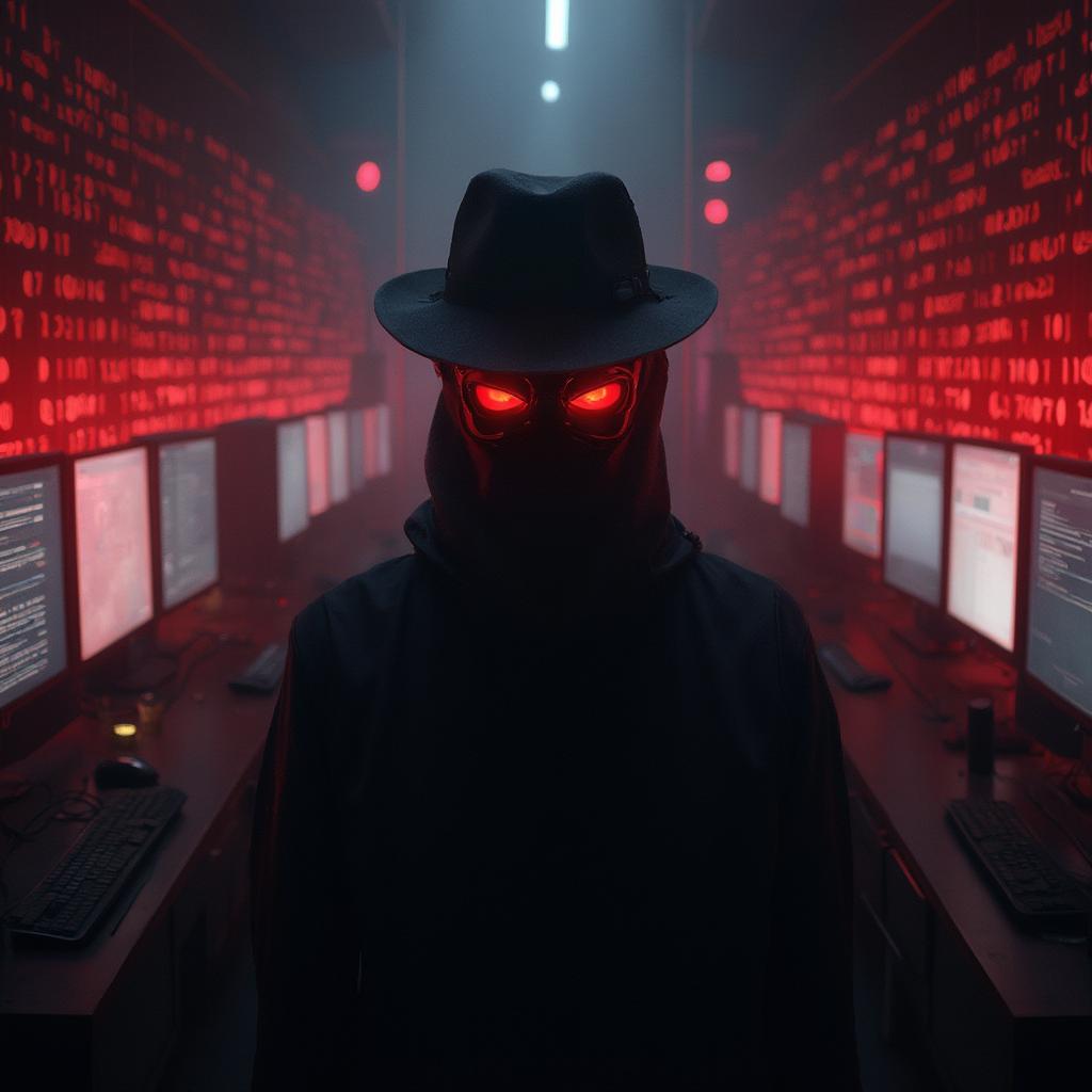 Типо хакер по кибербезопасности (деф) по середине стоит, смотрит прямо типо в душу в маске где лица невидно а только глаза светится красными глазами с панамкой-кепкой и такой немного пара по всей комнате типо тоже красный цветом, по бакам этого хакера компьютеры а в экранах всякие нолик и идиницы зелёным цветом и роутеры и провода и мышки и клавиатуры и на одежде хакера написано "@Zer0Trace_Official" и ищо 2 надписи это "TEAMWORK" и "Спектер" и всё и эти надписи были сильно видны и они правильно были написано как и я сказал