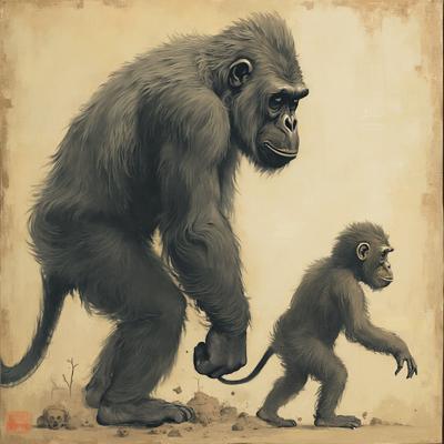 создай картинку по мотивам эволюции Дарвина (когда идёт эволюцию от обезьяны к человеку), уточнение :, сгенерируй по той же логике, как у Дарвина, только чтобы эволюция была не от обезьяны к человеку, а от смешной обезьянки до нормальной (мужественной) до гориллы (что-то похожее на татуировку у Конора Макгрегора на груди, где изображена горилла)