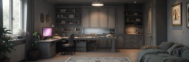 Маленькая темная комната подростка в серых тонах выглядит бедно в стиле 2000х. Обои в мягком сером оттенке гармонично сочетаются с паркетом, создавая уютную атмосферу. П-образный геймерский стол привлекает внимание, предоставляя достаточно места для игр и работы. Большой закрытый шкаф и стеллаж по бокам добавляют функциональности и помогают организовать пространство. Дамский столик у стены придает комнате изысканности, а два стильных кресла и комфортное компьютерное кресло создают идеальные места для отдыха и работы. Вся мебель в серых и черных цветах подчеркивает лофт-стиль, создавая гармоничное и привлекательное пространство.
