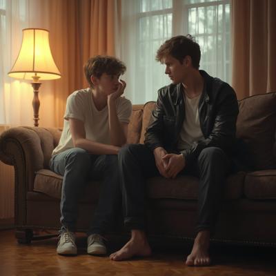 Реалистичная фотография. Домашняя подростковая светлая комната, в углу светит торшер, паркетный пол, c занавесками. На диване сидят и разговаривают друг с другом двое: грустный понурившийся мальчик подперший голову одной рукой, он в белой футболке, ему 16 лет и его старший брат 27 лет в черной кожаной куртке сидит рядом на диване и объясняет мальчику на жестах. На компьютерном столе стоит современный компьютер, на экране монитора вертикальные полосы из зеленых символов в стиле "Матрица".