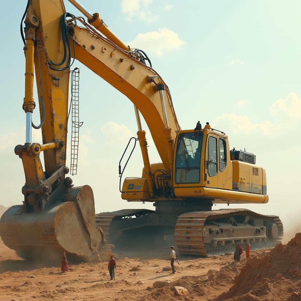 Ultra-photorealistic yellow tracked excavator on a dusty construction site, huge scale with tiny human figures about one tenth its height (some standing on the tracks, some sitting casually on the bucket, others climbing a ladder attached to the side of the excavator), low angle 3/4 cinematic view, dramatic golden hour sunlight with long soft shadows, HDR-style high contrast and vivid details, cinematic volumetric lighting, lens flare, fine dust particles and light haze glowing in warm light, ultra-detailed textures on metal, dirt, and worn paint, shallow depth of field, epic movie-like atmosphere