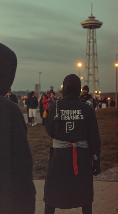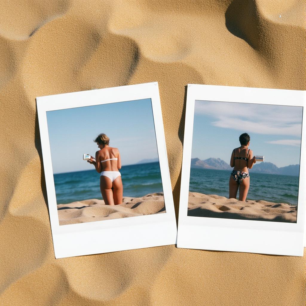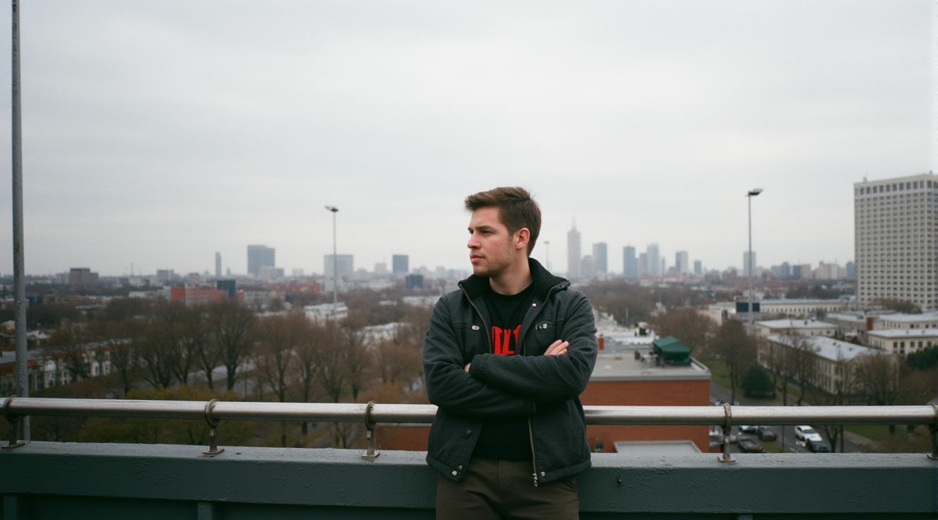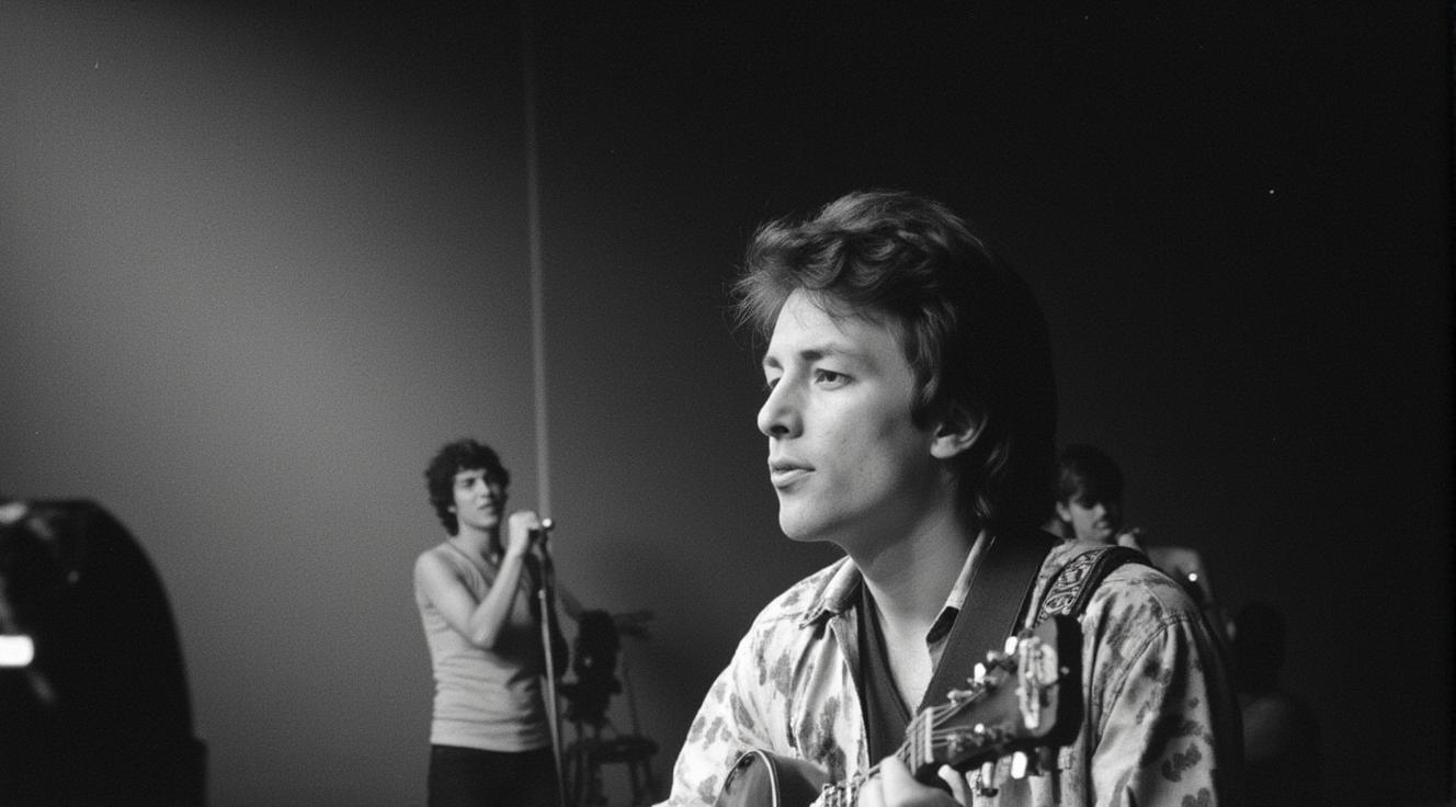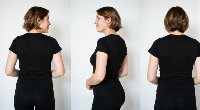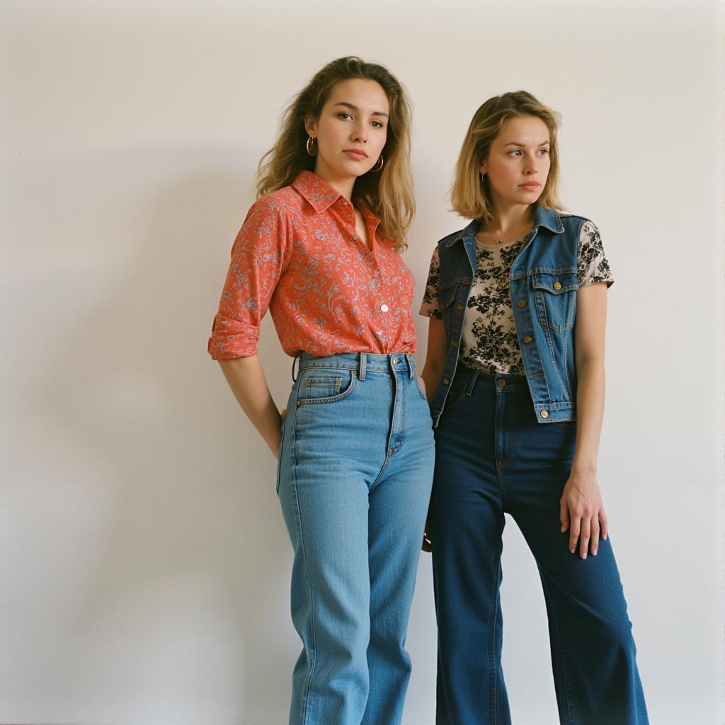 Реалистичное изображение девушки, стоящей спиной, в винтажной одежде 70-х годов. На ней джинсы с высокой посадкой и расклешённые штанины, свободная блузка с ярким узором или рубашка с широкими воротниками, а также джинсовая куртка или кожаная жилетка. Образ дополнен винтажной прической — длинные волосы с лёгкими волнами.