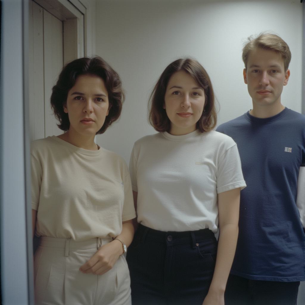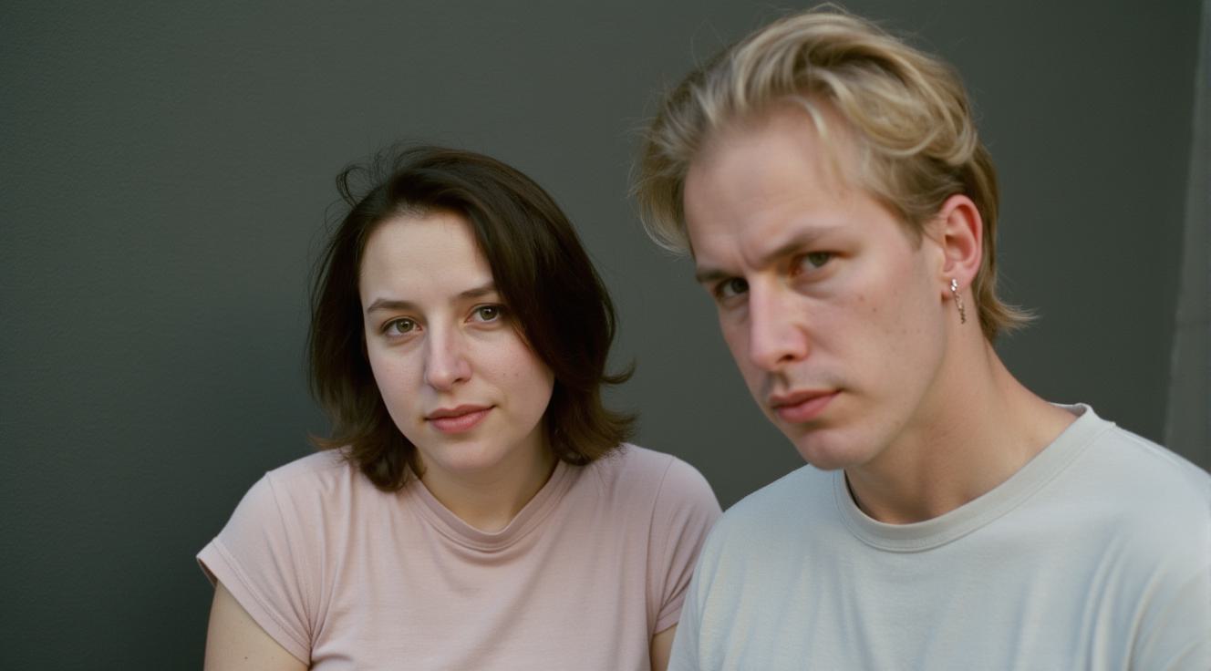 Женщина с темными коричневыми по плечи волосами и серыми глазами. Мать-одиночка в футболке и и черных штанах нос с легкой горбинкой и недовольное лицо и рядом мужчина с русыми светлыми волосами. И голубенькими глазами. Узкое лицо и мягкие черты. Прямой нос и родинка и светлые брови. Голубой костюм с красивым узорчатым галстуком. Доброе весёлое лицо