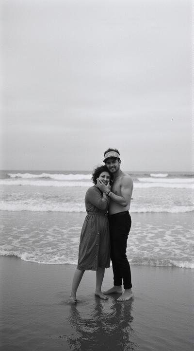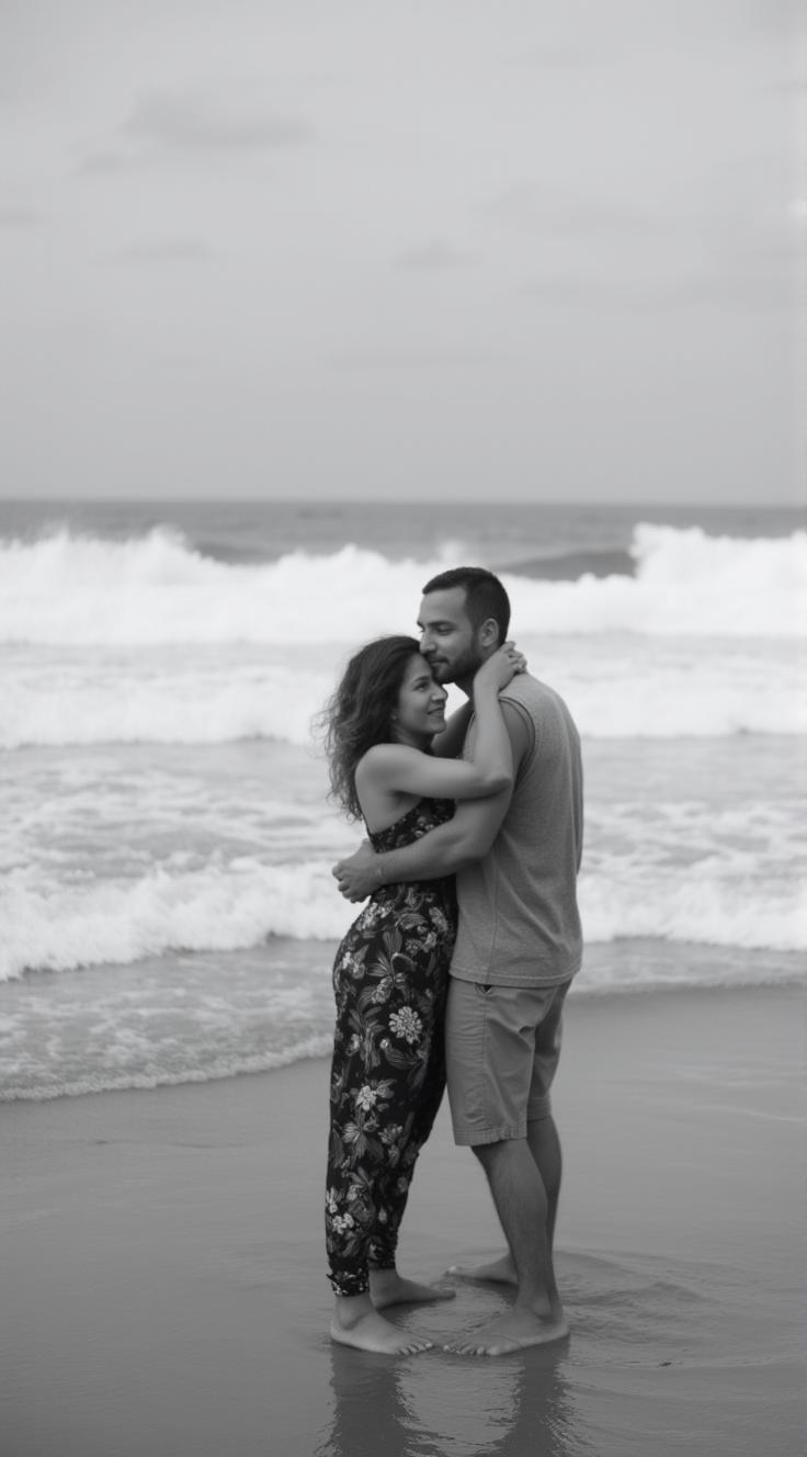 Сгенерируй черно-белую фотографию. На переднем плане пара: мужчина обнимает женщину, фото в динамике. они на морском берегу. Под ногами мокрый песок, стоят у кромки воды. Волосы женщины развеваются на ветру. На заднем плане — мощные волны, накатывающие на берег. Атмосфера романтики и свободы, немного драматичная. Высокое разрешение, чёткие детали, акцент на эмоциях пары. Контраст между мягкими линиями тел и резкими линиями пены. Эффект лёгкой зернистости, как у старых плёночных снимков. Композиция диагональная, с акцентом на движении. Ракурс сверху. Реалистичные детали, глубина резкости — пара в фокусе, фон слегка размытый.