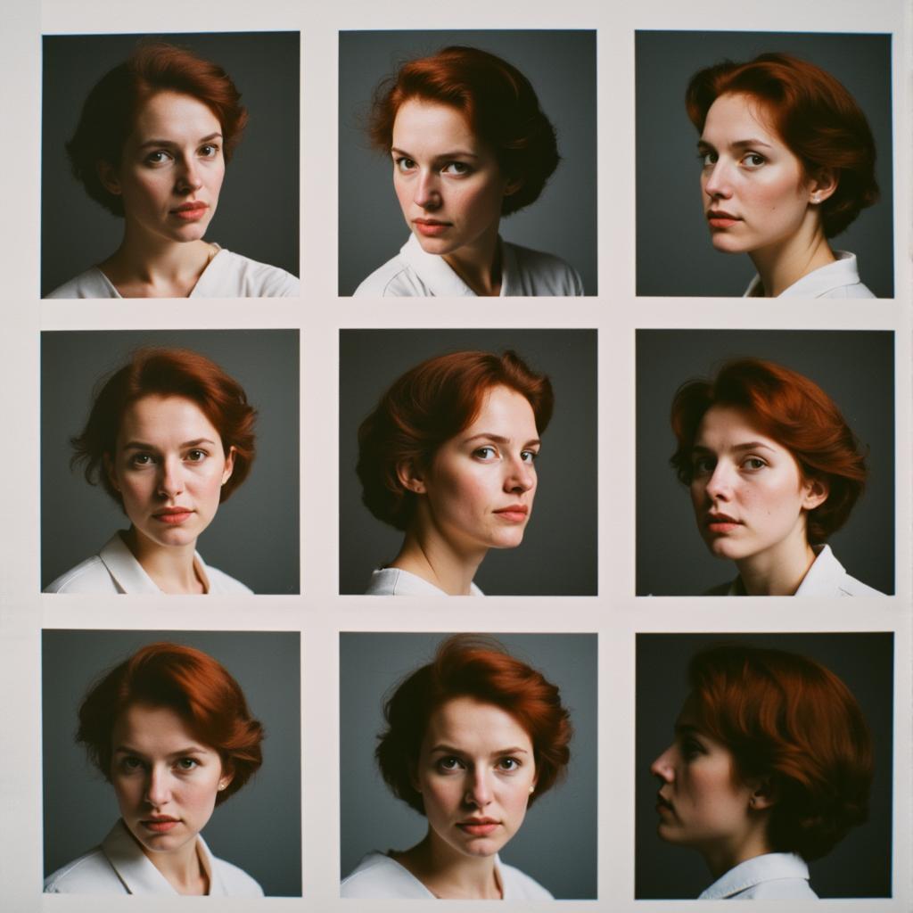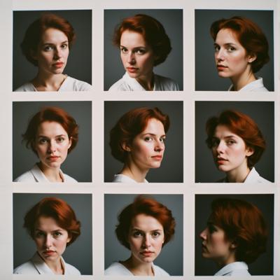 Создай 6 портретов одной и той же женщины - по пояс, в полный рост, в профиль, и три портрета. Женщина 30 лет с умным, спокойным, немного отстранённым взглядом. Темные волосы в рыжину. Немного морщин. Веснушки на лбу и щеках. Уверенность без надменности. Легкая, едва заметная улыбка в уголках губ, будто она знает интересный секрет. Свет мягкий, боковой, подчеркивающий черты лица. Ничего кричащего, только качественные текстуры (кашемир, дерево, бумага).