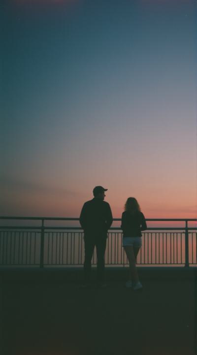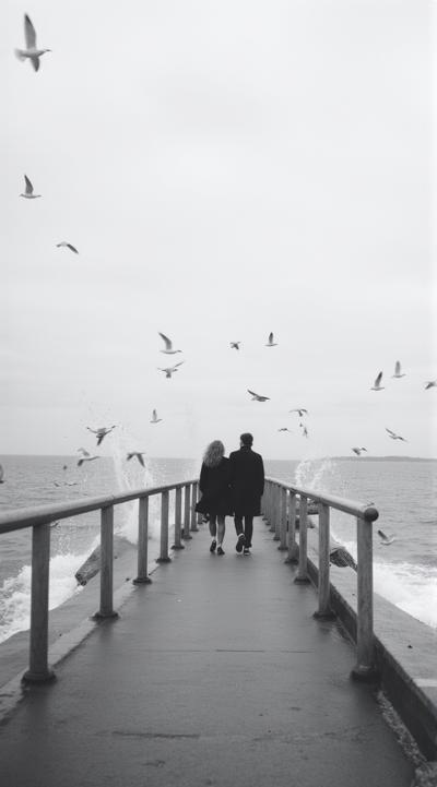 Сгенерируй изображение: влюблённая пара уходит вдаль по пирсу, окружённая стаей чаек. Серое небо, беспокойное море, брызги воды. Передай ощущение уединённости и романтики, используй приглушённые черно-бело-серые тона. Лёгкая размытость на переднем плане для глубины. Так же добавь эффект, будто фото сделано на пленочном фотоаппарате