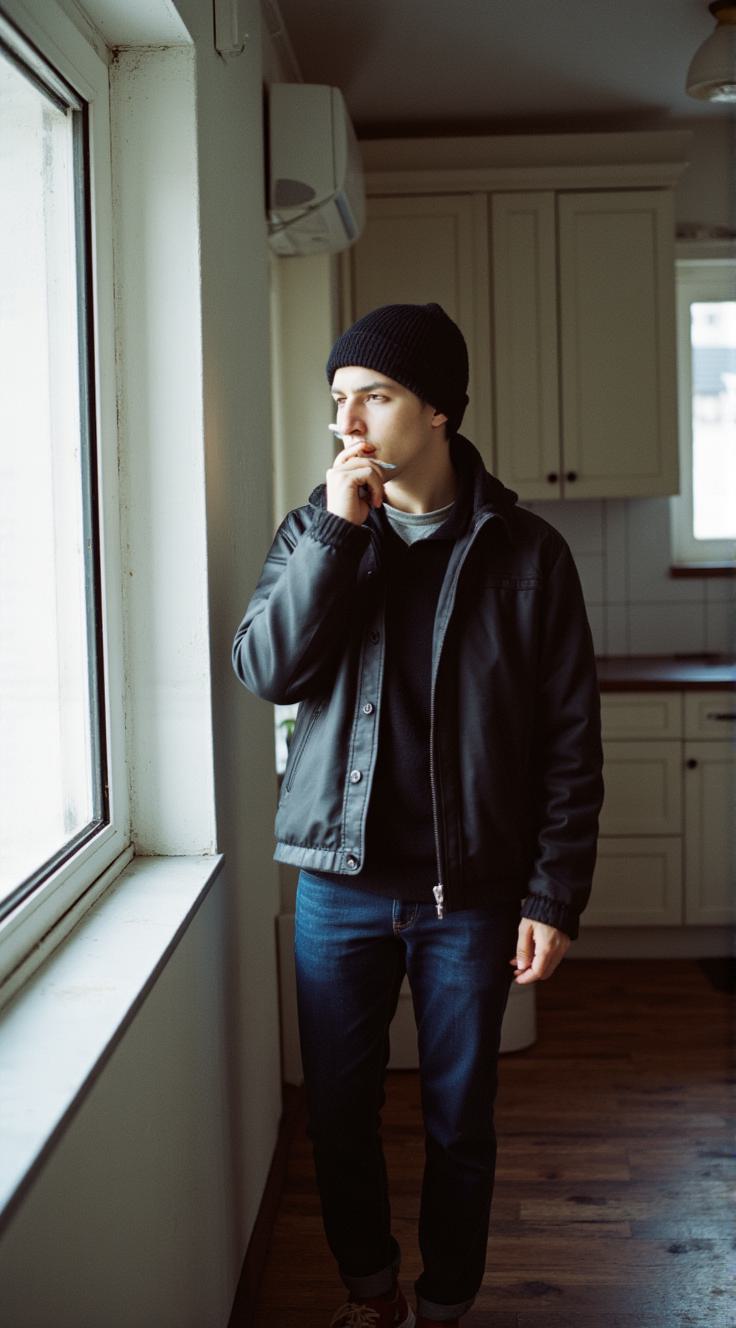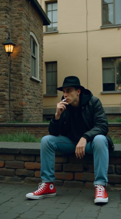 Молодой Парень с мешками под глазами уставший грустный в чёрной шапке в кожаной чёрной куртке в джинсах на ногах conversallstars красные держит в руках сигарету выдыхает дым, сидит на скамейке во дворе тускло светит на него фонарь, ,Между панельных домов, Снова хотел прожить этот день, его допить до конца, Жаль, там не было твоего лица, Просто гулял по старым дворам, и детство вспоминал, Я верил и ждал, Если наступит пора уезжать, Из города ночью, как вор, Загляни в старый детства наш двор, Там, на скамье ты встретишь меня, Мы сядем и выпьем вина, Ну, привет, ну, пока