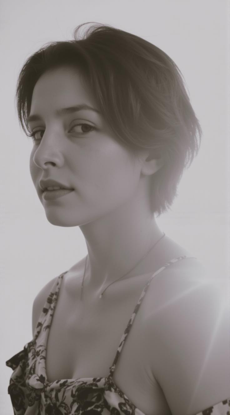 Хорошо, вот промт с добавлением ФИО:, "Женщина-андроид, выглядящая как милая, молодая девушка с именем София Александровна Смирнова. У неё умные, но добрые глаза, мягкое освещение, короткие или средней длины волосы, современный, элегантный, но неброский стиль. Атмосфера: спокойствие и мудрость. Качество: фотореалистичное, высокий уровень детализации.",