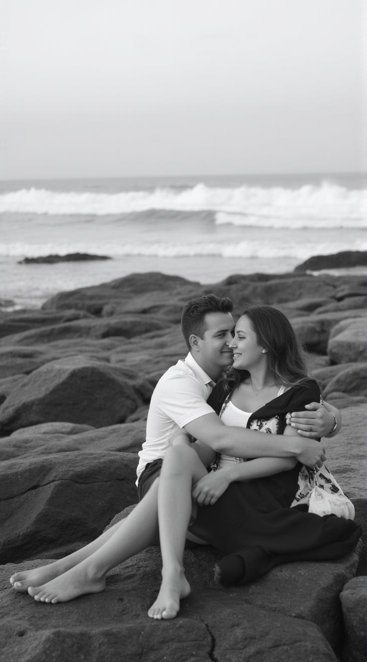 Сгенерируй чёрно-белую фотографию: влюблённая пара сидит на скалистом берегу у моря. Мужчина обнимает женщину, она слегка склонила голову к нему. Волны разбиваются о камни на заднем плане. Мягкий фокус на фоне, пара в резком фокусе. Атмосфера спокойная, романтичная. Естественные позы, расслабленные выражения лиц. Высокое разрешение, детализация текстур кожи, ткани одежды и камней.»
